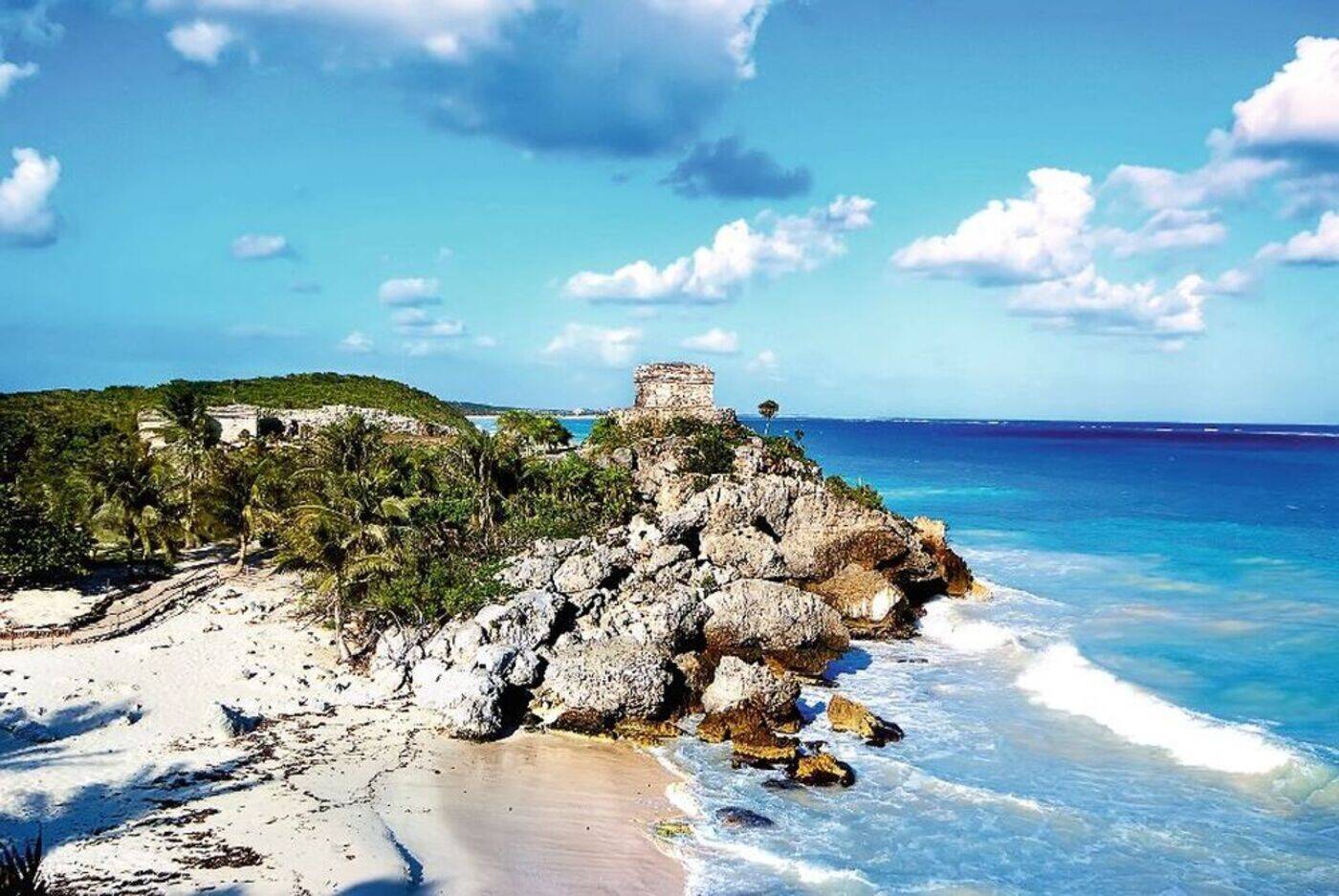 Ihr Ausflug bringt Sie zu der Maya-Felsenfestung von Tulum, direkt am karibischen Meer gelegen. Geblieben ist von der großen Maya-Stadt nur der Tempelbezirk mit dem Palast. Weitere Gebäude sind der Templo del Dios Descendente und der Templo de los Frescos. Tulum's Reiz liegt im Zusammenspiel der Ruinen mit dem weißen Sand und dem türkisblauen Wasser.