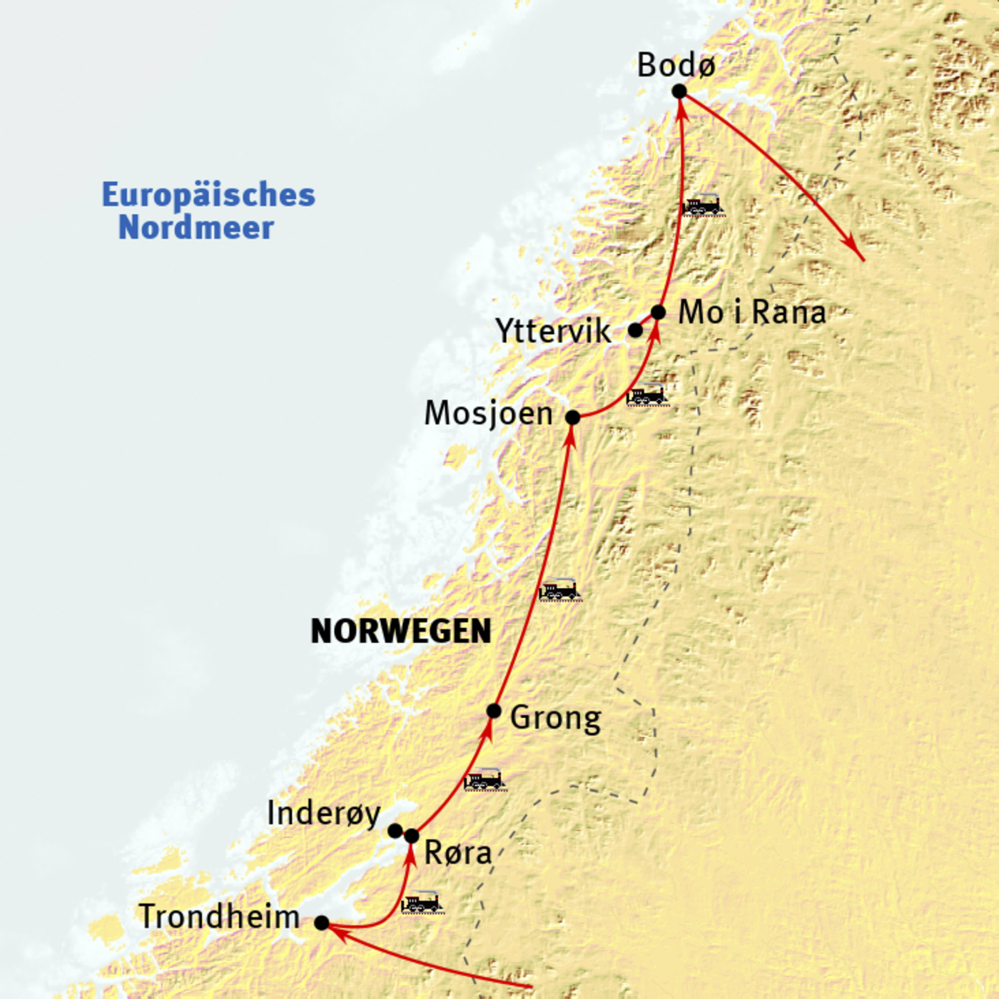 Trondheim - Røra - Inderøy - Grong - Mosjøen - Mosjøen - Mo i Rana - Yttervik - Bodø