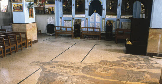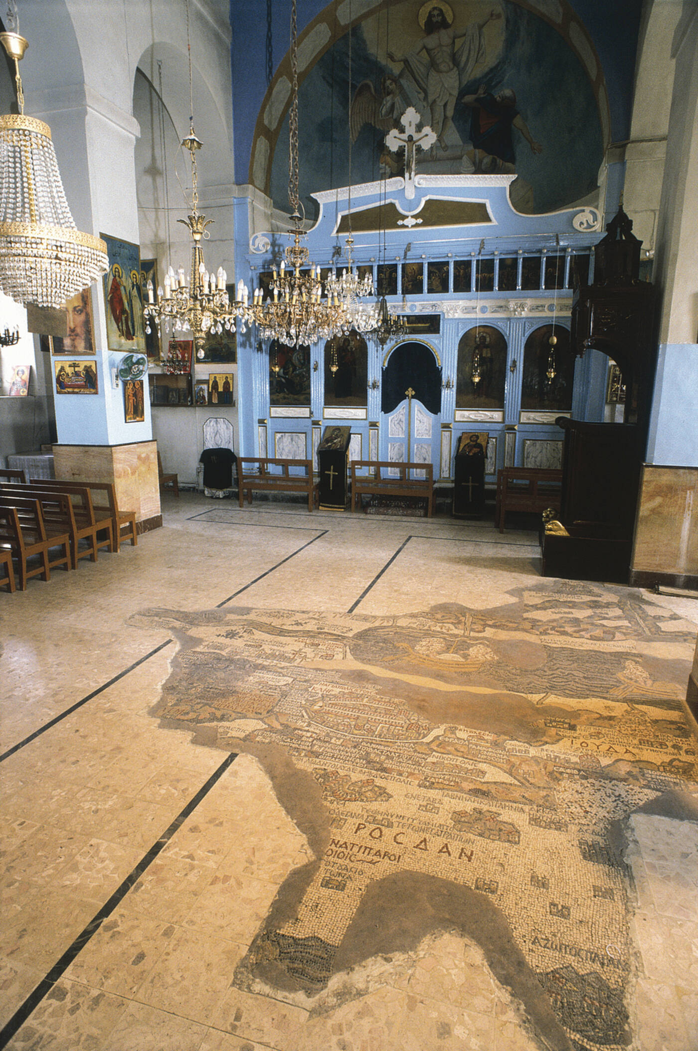 Auf der Antiken Königsstraße Fahrt über Madaba – hier die byzantinische Mosaikkarte Palästinas in der Georgs-Kirche – zum Berg Nebo. Anschließend weiter zum Toten Meer, Gelegenheit zum Schwimmen im stark salzhaltigen Wasser (33 % Salzgehalt) am tiefsten Punkt der Erde, 430m unter dem Meeresspiegel. Eine Übernachtung in einem Strandhotel. (245 km)