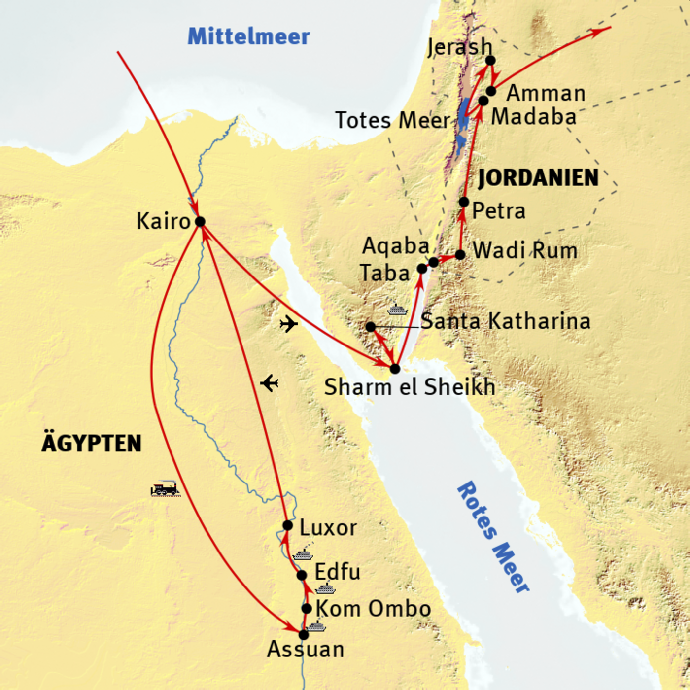 Nach zwei Besichtigungstagen in Kairo Nachtfahrt per Bahn (1. Klasse Schlafwagen) nach Assuan und von hier aus eine viertägige Nilkreuzfahrt durch Ober-Ägypten nach Luxor. Unterwegs dann auch die Besichtigung der Tempelanlagen von Edfu und Kom Ombo. Per Inlandsflug von Luxor weiter nach Sharm El Sheikh, hier zwei Tage in einem Strandhotel am Roten Meer und ein Besuch des wunderbaren Katharinenklosters. Es folgt eine Fahrt mit der Fähre von Taba nach Aqaba (Jordanien) und weiter überland nach Petra, mit einem Abstecher unterwegs in die Wüste Wadi Rum. Die kolossale Nabatäerstadt Petra besichtigen wir einen ganzen Tag lang. Über die historische Königsstraße fahren wir dann über den Berg Nebo und Madaba zum Toten Meer, hier eine Nacht in einem schönen Strandhotel, am tiefsten Punkt der Erde. Zum Abschluss der Reise entdecken wir die Ruinenanlage von Jerash und die Hauptstadt Jordaniens, Amman.