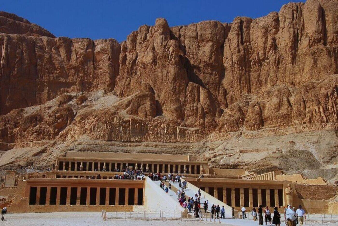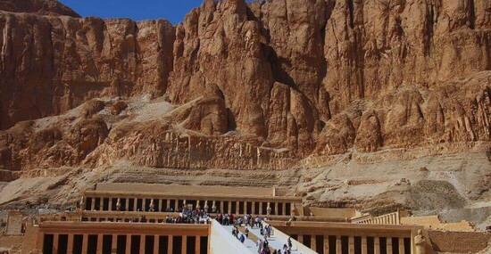 Ausschiffung und Fahrt zum westlichen Nilufer, nach Theben-West. Besuch des Tals der Könige, des Tempels der Hatschepsut Deir-el-Bahari vor der eindrucksvollen Kulisse hoher Steilfelsen, danach die zwei Memnon-Kolosse. Nachmittags Fahrt durch die Wüste ans Rote Meer und weiter entlang der Küste nach Hurghada zu unserem Strandhotel. (280 km)