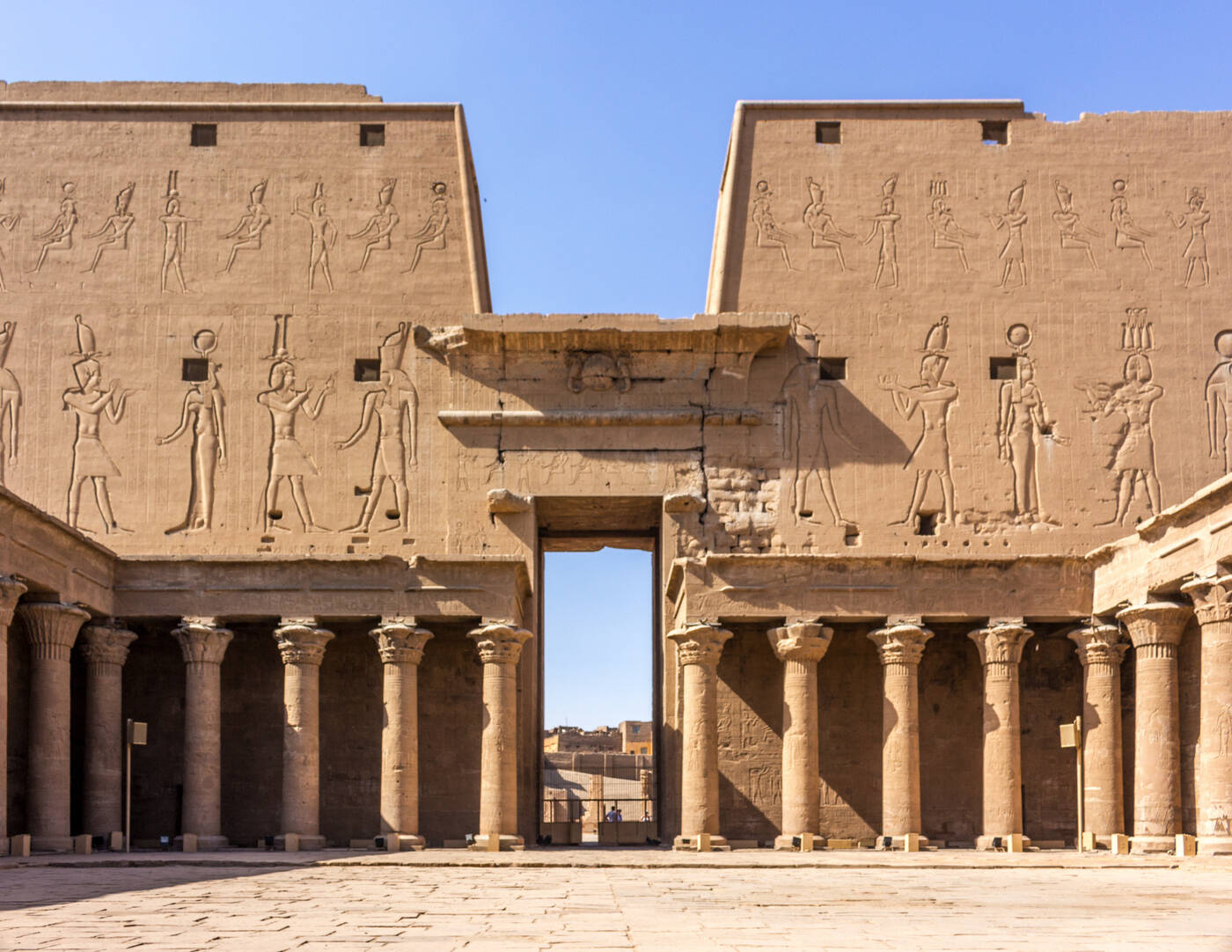 Vormittags Besichtigung des Horus-Tempels von Edfu, mit einem riesigen Pylonen und einer Umfassungsmauer eine der am besten erhaltenen ptolemäischen Tempelanlagen Ägyptens. Kreuzfahrt nach Luxor. Nachmittags Zeit für einen Bummel entlang der Corniche. Die letzte Übernachtung an Bord des Nilschiffs. (130 km)