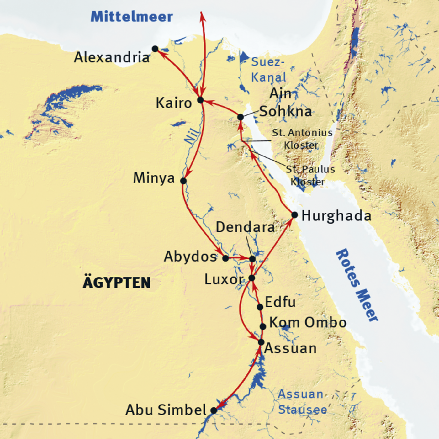 Kairo - Alexandria - Gizeh - Minya - Abydos - Dendera - Luxor - Assuan (- Abu Simbel) - Kom Ombo - Edfu - Luxor - Theben-West - Hurghada - Kairo
