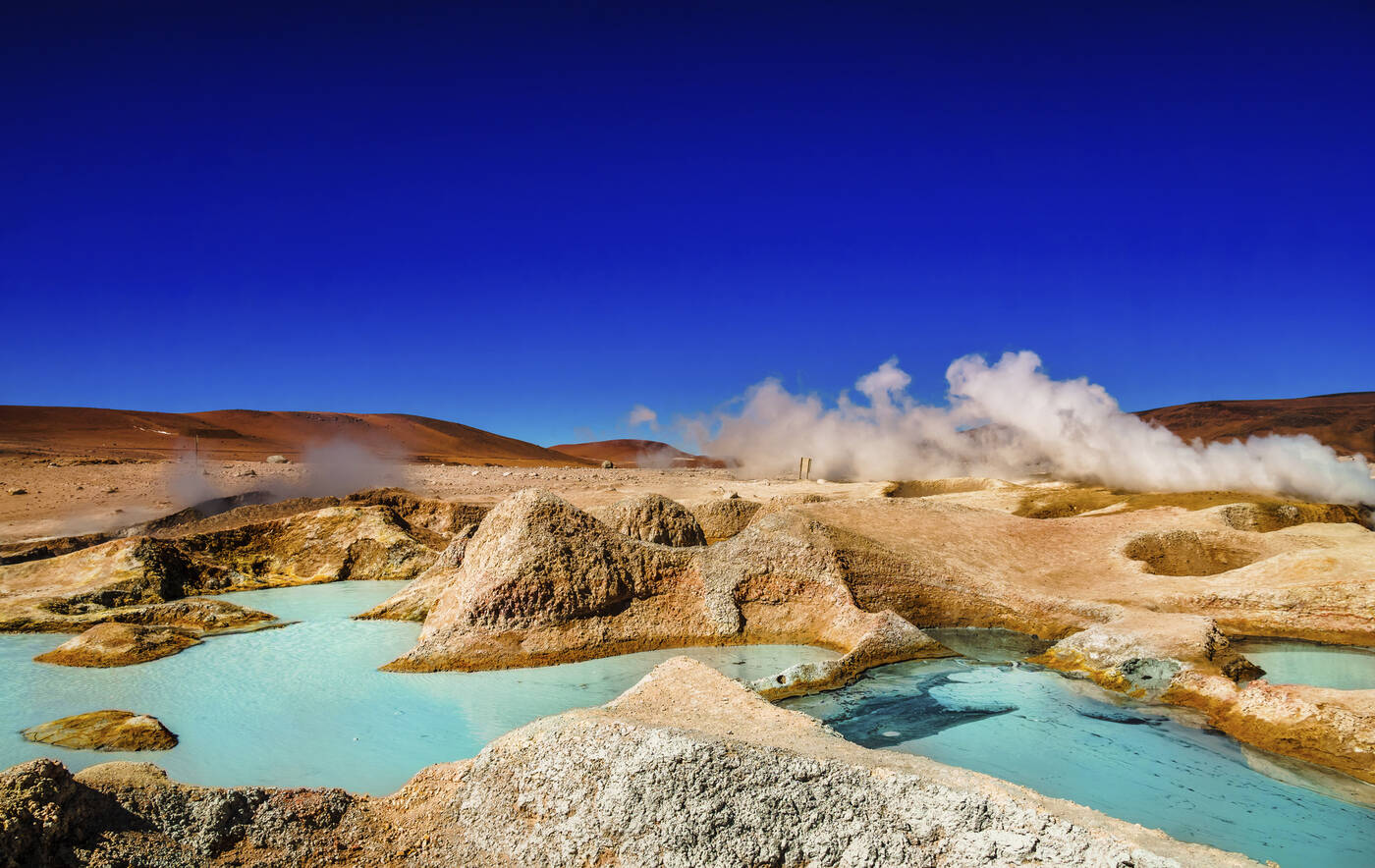 Weiter zur Laguna Colorada mit ihrem rötlich schimmernden Wasser und zum Geysirfeld Sol de Mañana mit zischenden Fontänen und blubbernden Erdlöchern auf 5.000 m Höhe. Nachm. Besuch der Laguna Verde am Fuß des Licancabur Vulkans, anschl. zurück nach Chile und Fahrt nach San Pedro de Atacama.