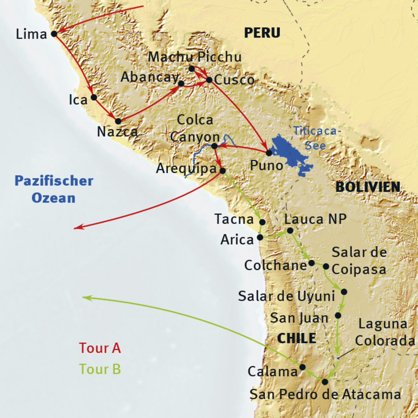 Lima - Paracas - Ica - Nazca - Abancay - Cusco - Machu Picchu - Titicaca See - Colca Canyon - Arequipa - Tacna - Lauca NP - Salar de Coipasa - Salar de Uyuni - Lagunengebiet - San Pedro de Atacama