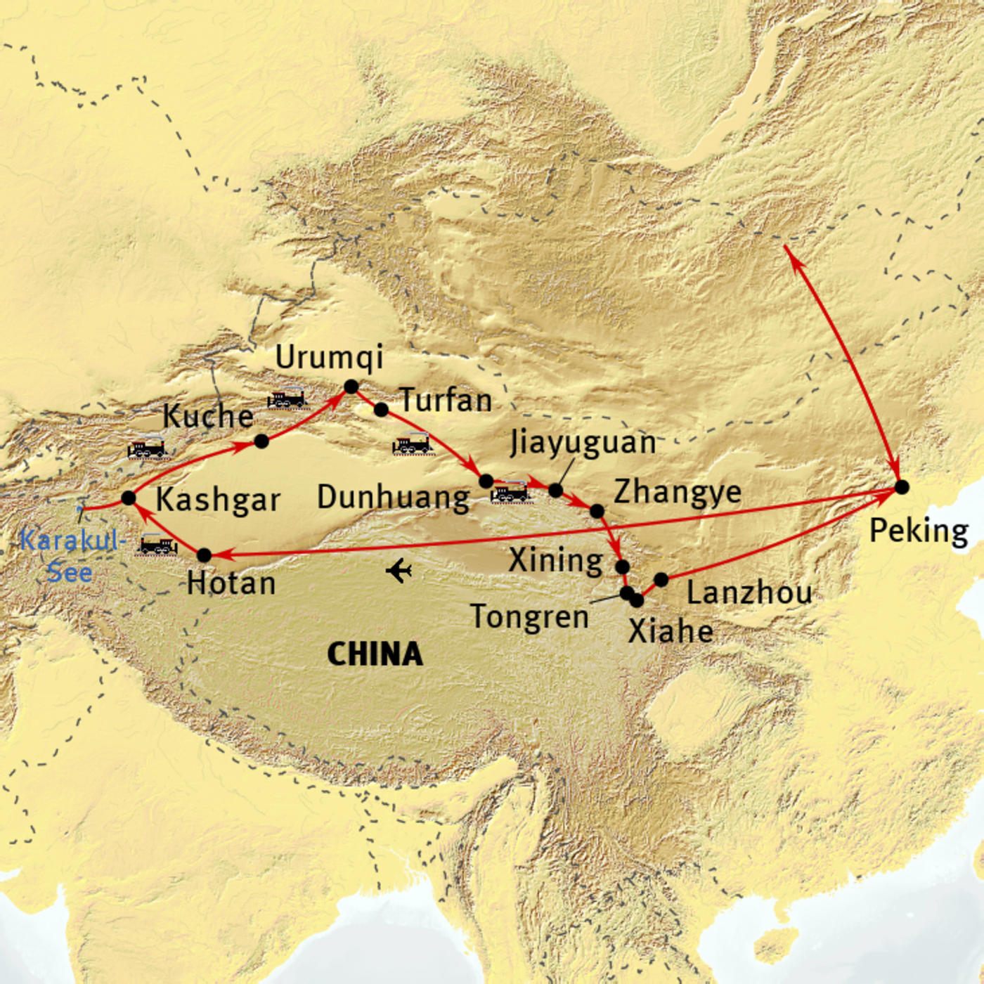 Peking - Hotan - Kashgar - Karakul-See -Kashgar - Kuche - Urumqi - Turfan - Dunhuang - Jiayuguan - Zhangye - Xining - Tongren - Xiahe - Lanzhou