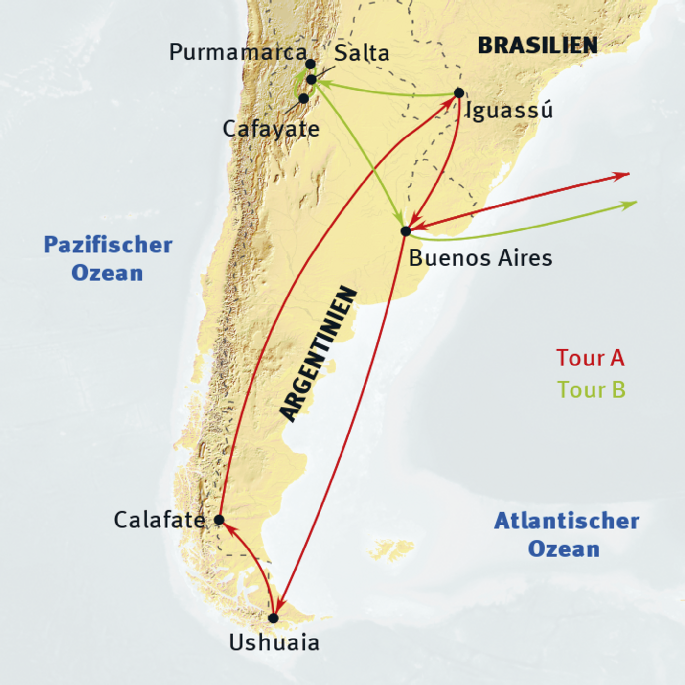 Eine Fülle von Naturwundern erwartet Sie: Im Norden die größten Wasserfälle der Erde in Iguassú, im Süden der traumhafte Perito Moreno-Gletscher am Lago Argentino, und noch weiter südlich schließlich mit Feuerland die Südspitze des amerikanischen Kontinents. Als eindrucksvoller Kontrast die Großstadt Buenos Aires. Wahlweise als Verlängerung der "Geheimtipp" Nordwesten: Die Schluchten-Landschaft von Humahuaca mit dem "Berg der Sieben Farben", ursprüngliche Dörfer und Kolonialstädte. Entdecken Sie Argentinien!