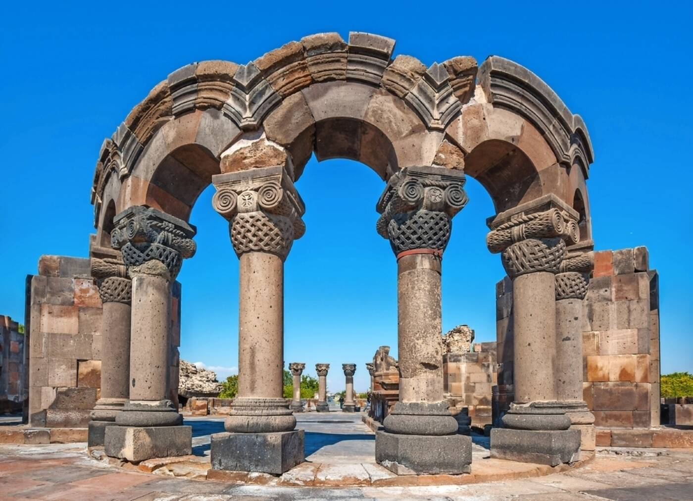 Ankunft frühmorgens. Empfang durch die Reiseleitung, Transfer zum Hotel (3 Nächte). Am Vorm. späterer Start mit Fahrt vorbei am Dorf Mussa Ler mit dem Memorialkomplex für den Widerstand von Musa Dagh (bekannt durch den Roman von Franz Werfel), nach Etschmiadsin, Zentrum der armenischen autokephalen Kirche und Sitz des Katholikos. Besuch der Hauptkathedrale (303 n.Chr./z.Zt. nur von außen zu besichtigen) und des Parks mit wunderschönen Kreuzsteinen. Besichtigung der Kirche Surb Hripsime (7.Jh.), ein Meisterwerk der klassischen armenischen Baukunst. Auf dem Rückweg Stop an der Ruine der ersten armenischen Rundkirche von Zwartnoz (7.Jh.) und Kaffeepause im Garten eines Musikers, der das armenische Nationalinstrument Duduk aus Aprikosenholz schnitzt und für uns spielt. Abendessen.