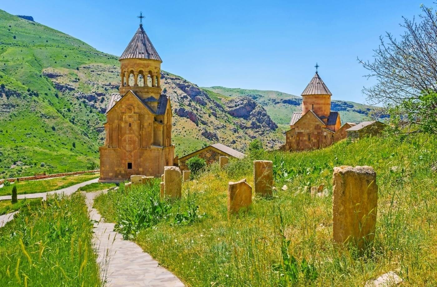 Heute Fahrt durch das Ararattal nach Chor Virap („tiefe Grube“). Das Kloster liegt unmittelbar an der türkischen Grenze, von hier bietet sich ein herrlicher Blick auf den Ararat, den heiligen Berg der Armenier. Weiterfahrt durch eine bekannte Weingegend zum Kloster Noravank, malerisch am Ende einer Schlucht gelegen. Dann Fahrt zum auf einer Hochebene gelegenen Zorats Kar, eine der ältesten prähistorischen Kultstätten Armeniens. Hotel in Goris.