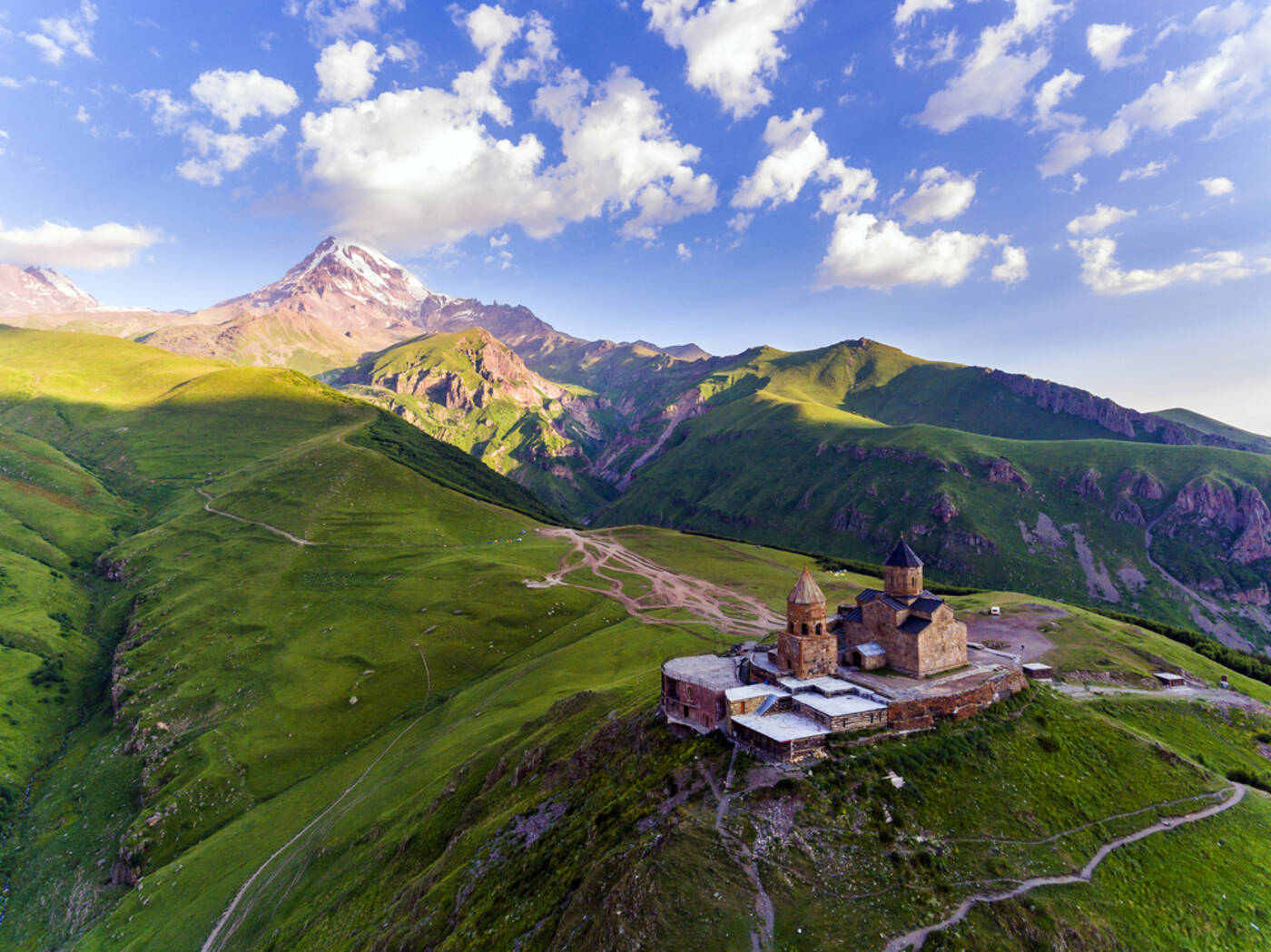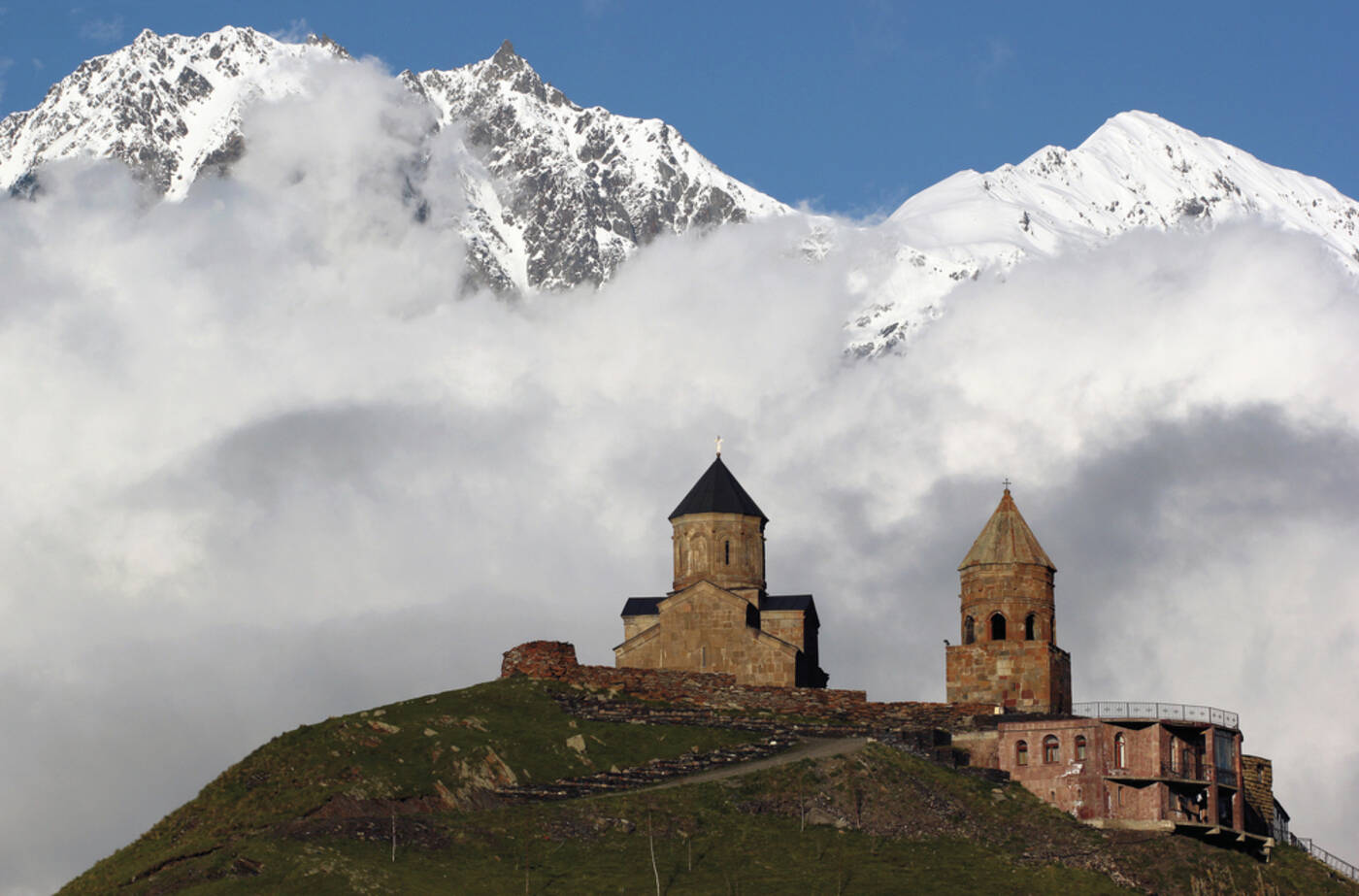 Morgens von Stephansminda (Kazbegi) mit Blick auf hochalpine Landschaften Auffahrt mit dem Jeep zu der 2.170m hoch gelegenen Gergeti-Dreifaltigkeitskirche. Wenn das Wetter mitspielt, ergibt sich von hier ein Traumblick auf einen der höchsten Gletscher im Kaukasus, den Kasbek (5.047m). Weiterfahrt nach Gori und Abendessen im Hotel.
