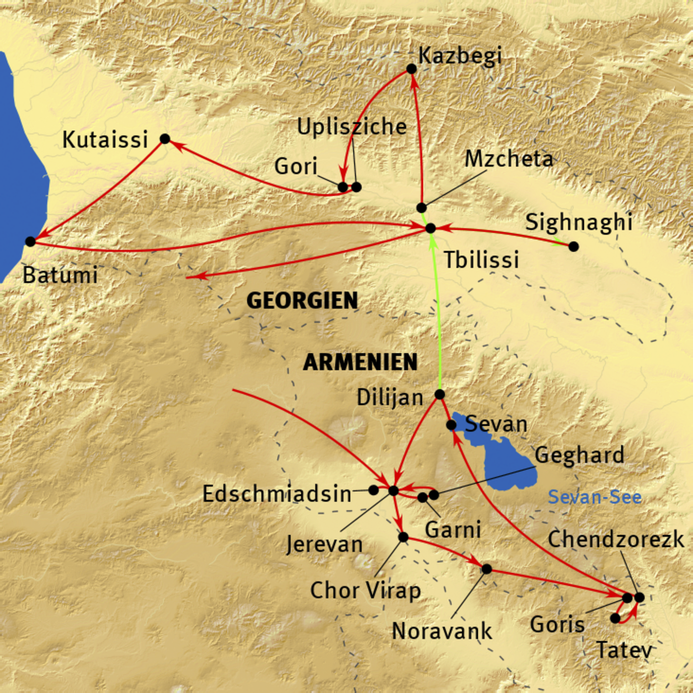 Armenien: Jerevan - Etschmiadsin - Garni - Geghard - Chor-Virab - Noravank - Zorats Kar - Tatev - Chndzoresk - Sevan-See - Goschawank - Sanahin - Haghpat - Akhtala - Tour B: Georgien: Tbilissi - Signagi - Mzcheta - Kasbegi - Gori - Uplisziche - Kutaissi - Gelati - Batumi - Tbilissi
