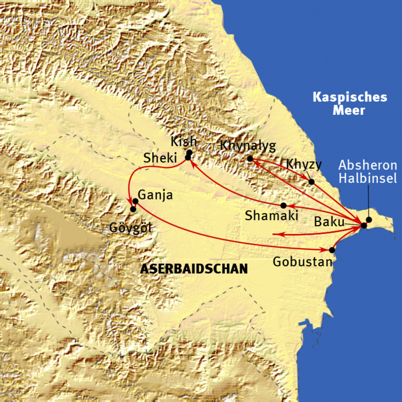 Baku - Halbinsel Absheron - Khynalyg - Khyzy - Shamaki - Sheki - Kish - Göygöl - Ganja - Gobustan - Baku