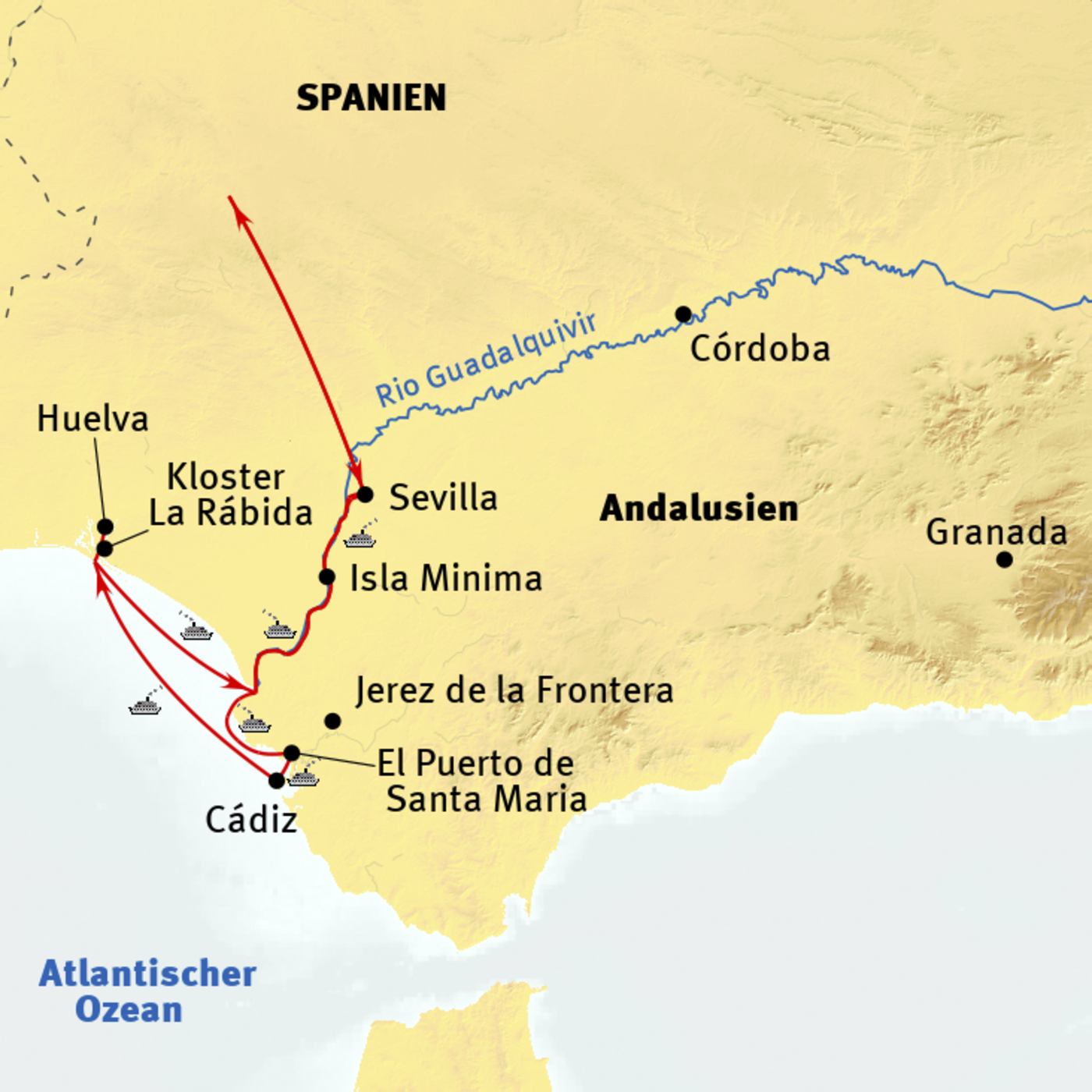 Entlang des Guadalquivirs erleben wir die Geschichte Andalusiens hautnah: In Huelva wandeln wir auf den Spuren der großen Seefahrernation, in Granada wehen uns orientalische Düfte und Klänge entgegen, und in Sevilla treffen Tradition und Moderne aufeinander. Natürlich kommt neben den historischen Highlights auch der Genuss nicht zu kurz. Wir lauschen den fesselnden Klängen des feurigen Flamencos, genießen den würzigen Sherry aus der Region rund um Jerez de la Frontera oder verkosten edle Tropfen in einer typischen Bodega. Andalusien hat auf jeden Fall für jeden Geschmack etwas zu bieten.