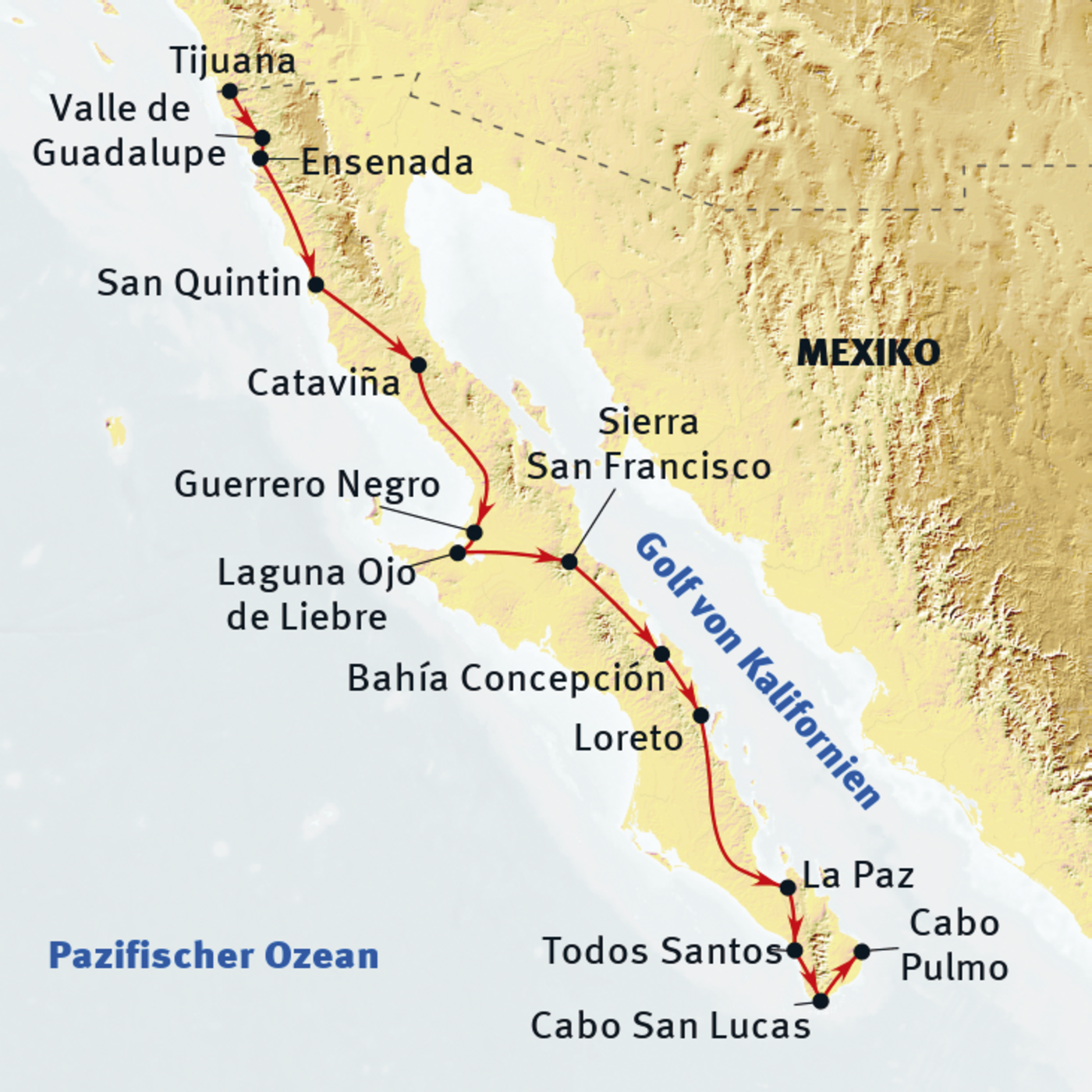 Tijuana - Valle del Guadalupe - Ensenada - San Quintín - Cataviña - Guerrero Negro - Laguna Ojo de Liebre - San Ignacio - Sierra San Francisco - Santa Rosalia - Oase Lulegé - Bahia Concepción - Loreto - Isla Coronado - Loreto - La Paz - Nationalpark Espíritu Santo - La Paz - Todos Santos - Cabo San Lucas - Cabo Pulmo