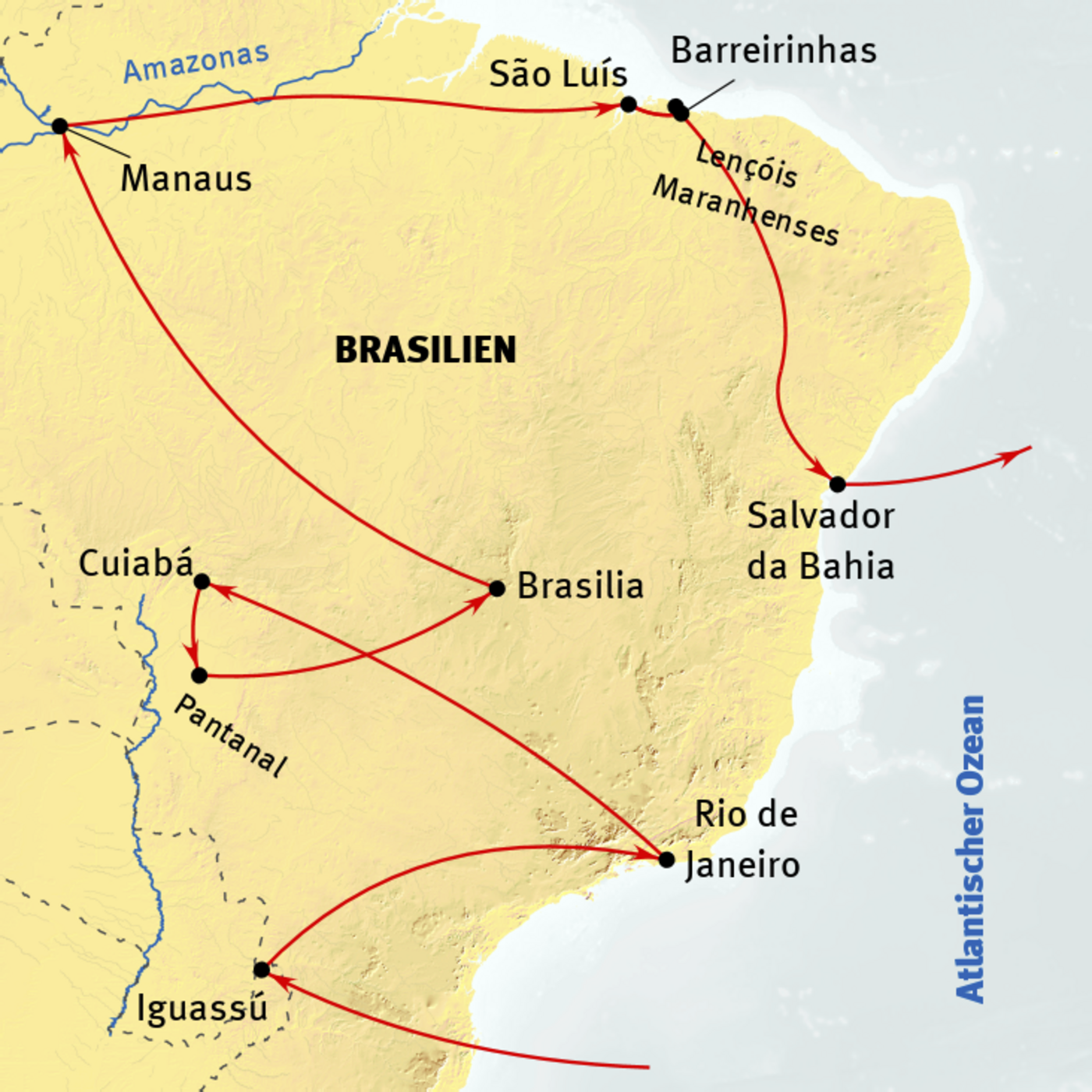 Brasilien ist ein riesiges, weites, vielseitiges und in vielem einzigartiges Land. Es füllt den gesamten Ostteil des südamerikanischen Kontinents und ist so etwas wie die „andere Seite“ Südamerikas. Besucher schätzen die Offenheit der Menschen und den entspannten Lebensstil. Der Karneval, der Körperkult und die extrovertierte Art sind typisch brasilianisch. Diese Reise fasst die Highlights zusammen: im Süden die Iguassú-Wasserfälle, im Norden die beeindruckenden Dünen von Lençois Maranhenses und der „Mythos Amazonas“, erkundet auf einer 4-Tage/3-Nächte Kreuzfahrt mit der MV UIARA AMAZON II. Kulturelle Sehenswürdigkeiten wie Salvador da Bahia, Brasilia und Rio de Janeiro stehen ebenfalls auf dem Programm.