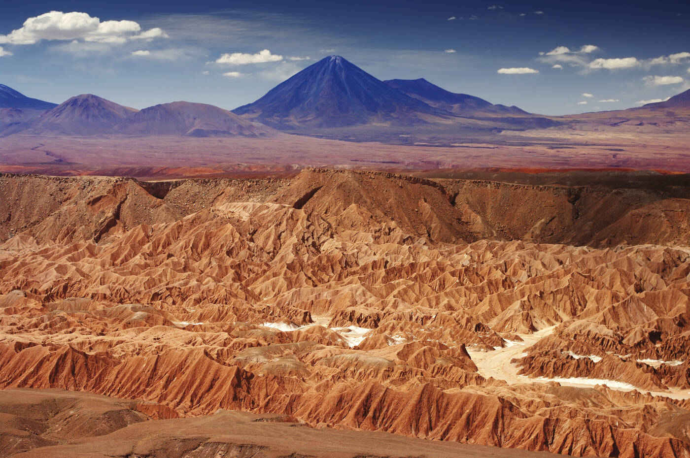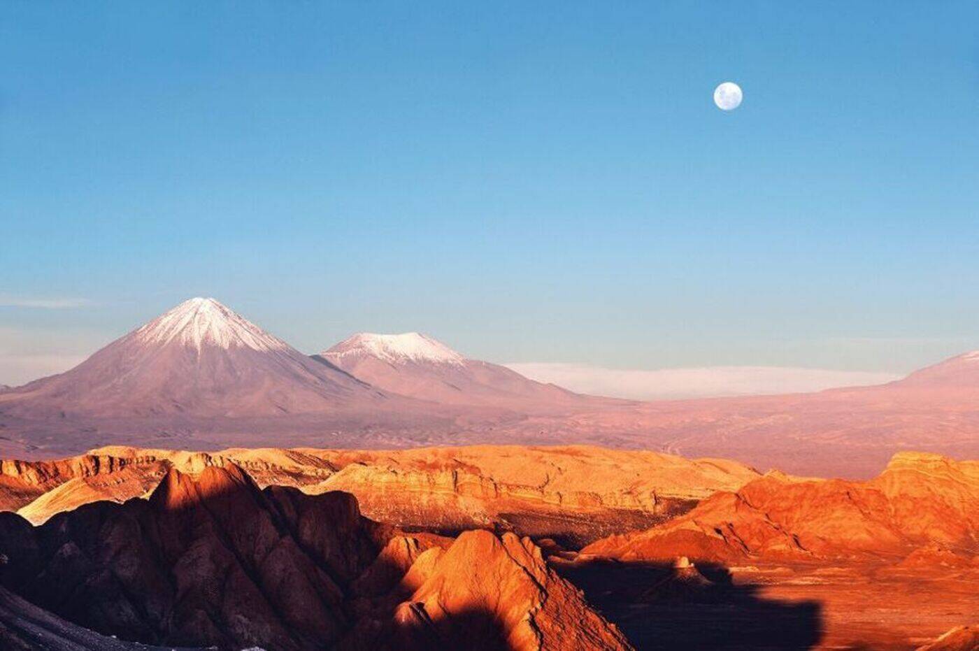 Weiter geht der Flug in den Norden nach Calama. Von hier erfolgt die Fahrt durch die bizzare Landschaft der Atacama-Wüste und vorbei an der Cordillera de la Sal in den Oasenort San Pedro. Bei einem Stadtrundgang lernen Sie den Wüstenort kennen, bevor Sie zum Mondtal aufbrechen. Seltsame Salz- und Felsformationen inmitten vegetationsloser Sandlandschaft und der Licancabur-Vulkan im Hintergrund verleihen dem Tal tatsächlich das Aussehen einer Mondlandschaft. Auf einer Düne können Sie den Sonnenuntergang über der Wüste genießen.