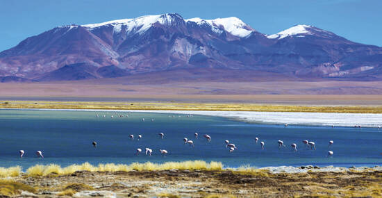 Ganztägige Wüstenexkursion: Zunächst geht es über die fast ganz aus Vulkanstein-Ziegeln gebauten Dörfer Toconao und Socaire hoch hinauf zu den türkis schimmernden Hochland-Lagunen Miscanti und Miñiques auf 4.300m. Anschl. besuchen wir den großen Salzsee "Salar de Atacama" (2.300m) und die Chaxa-Lagune mit ihren Flamingos (260 Tages-km).