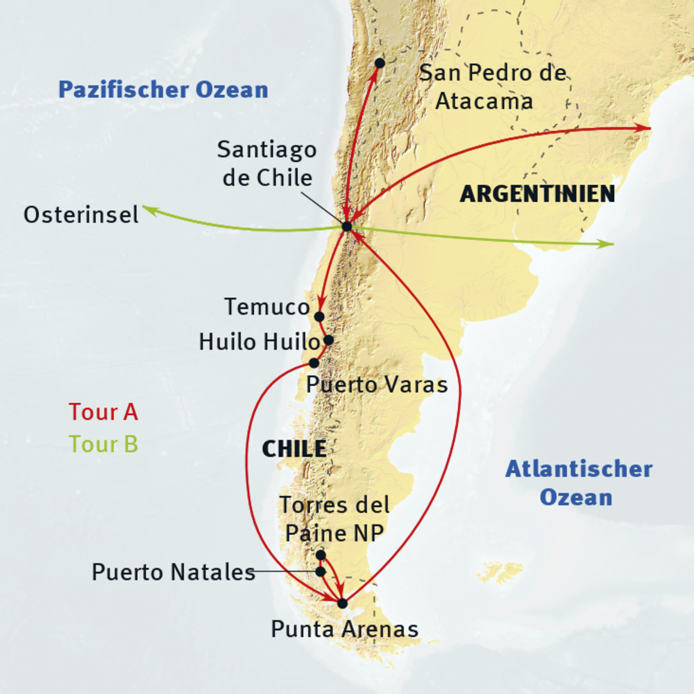 Santiago - Valparaiso - Malalcahuello - Conguillio NP - Huilo Huilo NP - Pto. Varas - Isla Chiloé - Pto. Natales - Torres del Paine NP - Pta. Arenas - Atacama - Osterinsel