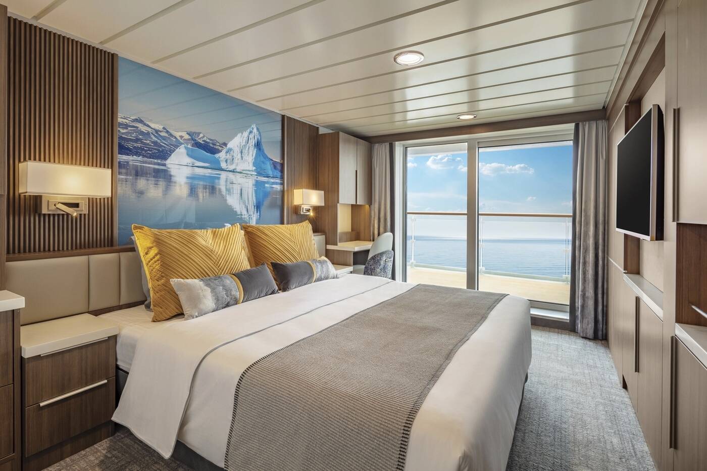 - Kat. H = Captain's Suite, Deck 4, Doppelbett oder zwei Einzelbetten, Du/WC, TV, privater Balkon, 40 m²