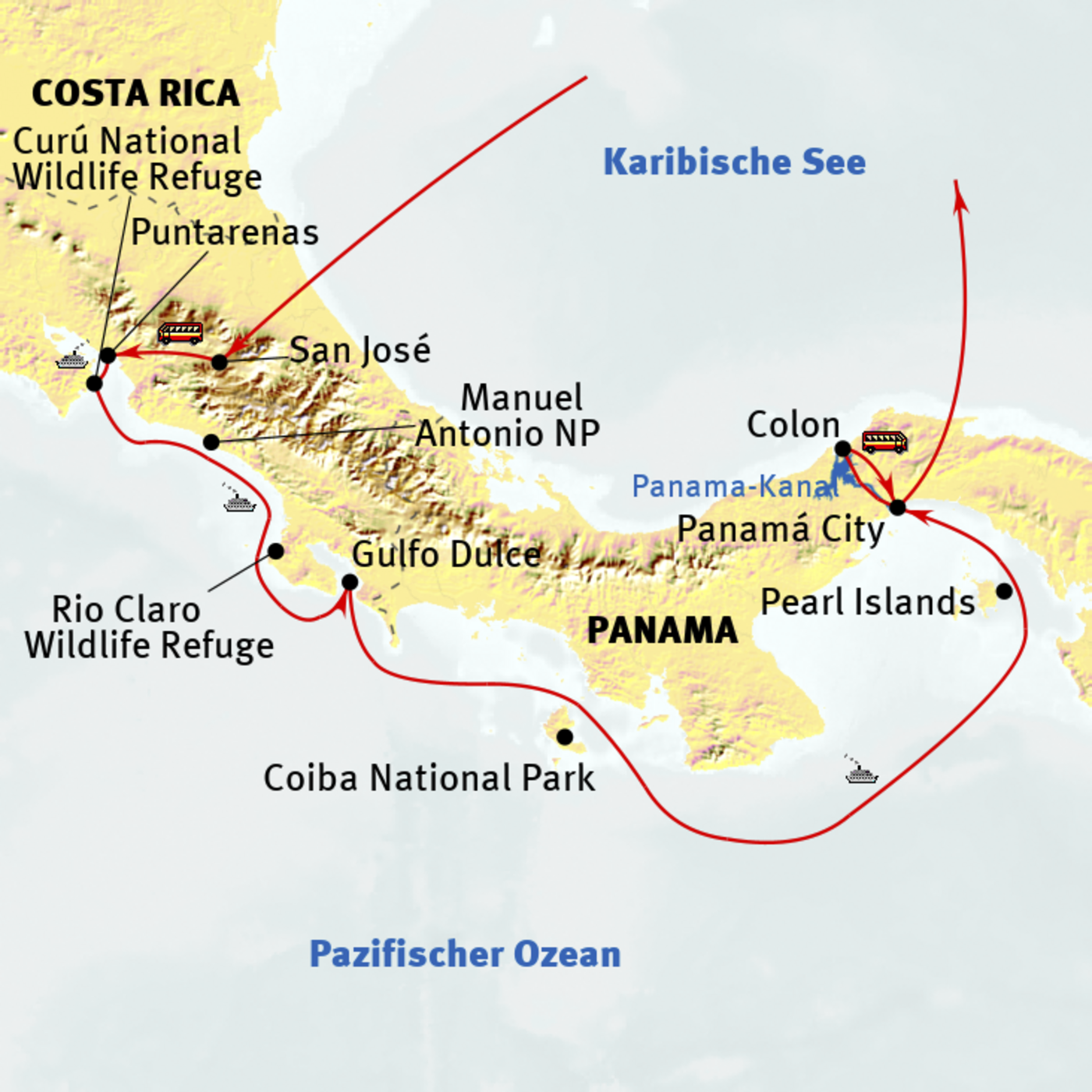 Wir fahren entlang der beeindruckenden Küsten Costa Ricas und Panamas. Costa Rica zählt zu den artenreichsten Regionen der Erde. Wir entdecken tropische Regenwälder, die von einer herausragenden Vielfalt an Wildtieren und schillernden Vogelarten besiedelt sind und uns mit Ihrer prächtigen Flora verzaubern. In Panama erkunden wir unberührte Korallenriffe und lernen die faszinierende Geschichte des Panamakanals kennen, den wir bei einer garantierten Tagespassage vom Pazifischen Ozean bis in die Karibik erleben.
