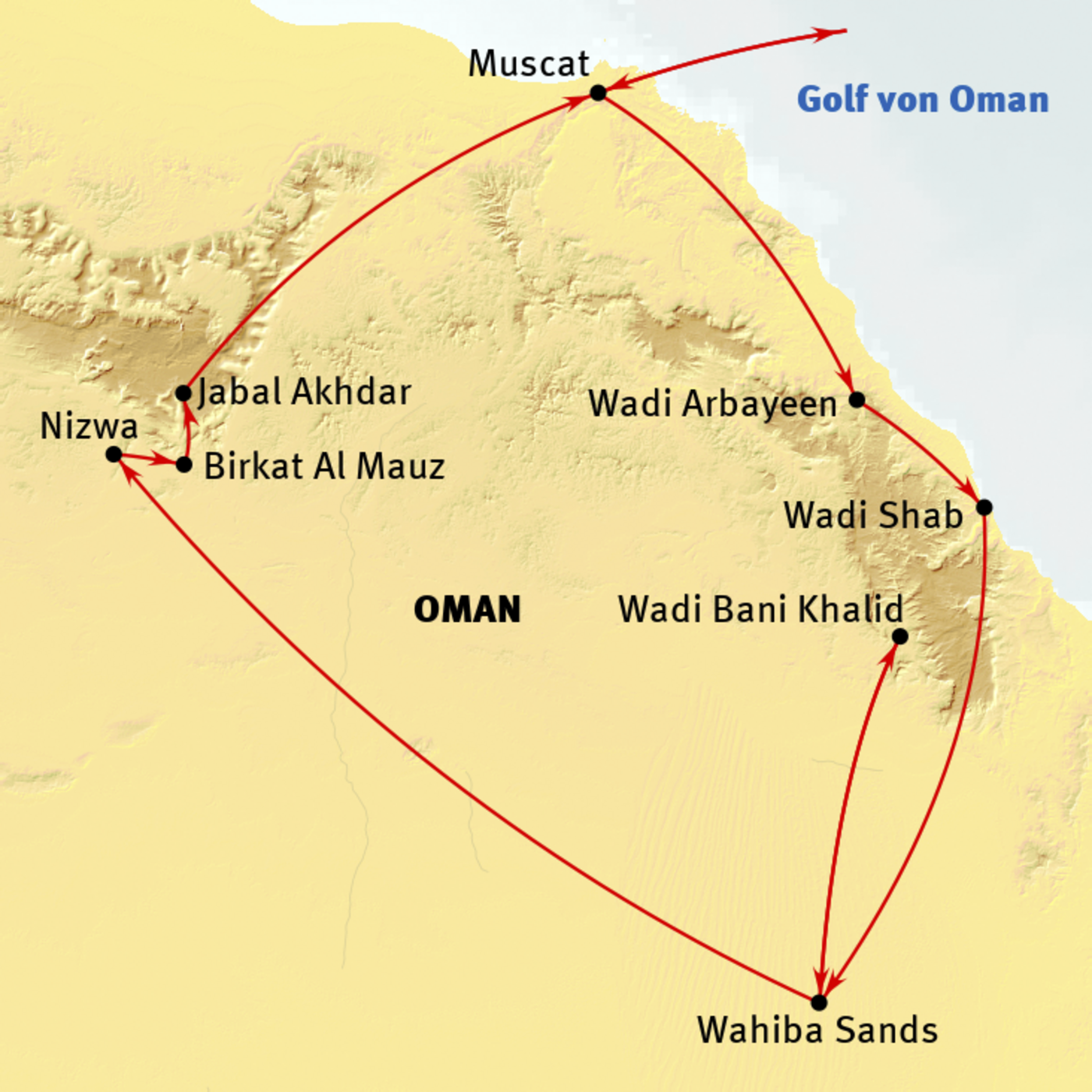 Muscat - Wadi Arbyn - Wadi Tiwi - Wahiba Sands - Wadi Bani Khalid - Wadi Bani Khalid - Al Hamra - Nizwa - BIrkat Al Mauz - Jabal Akhdar - Muscat