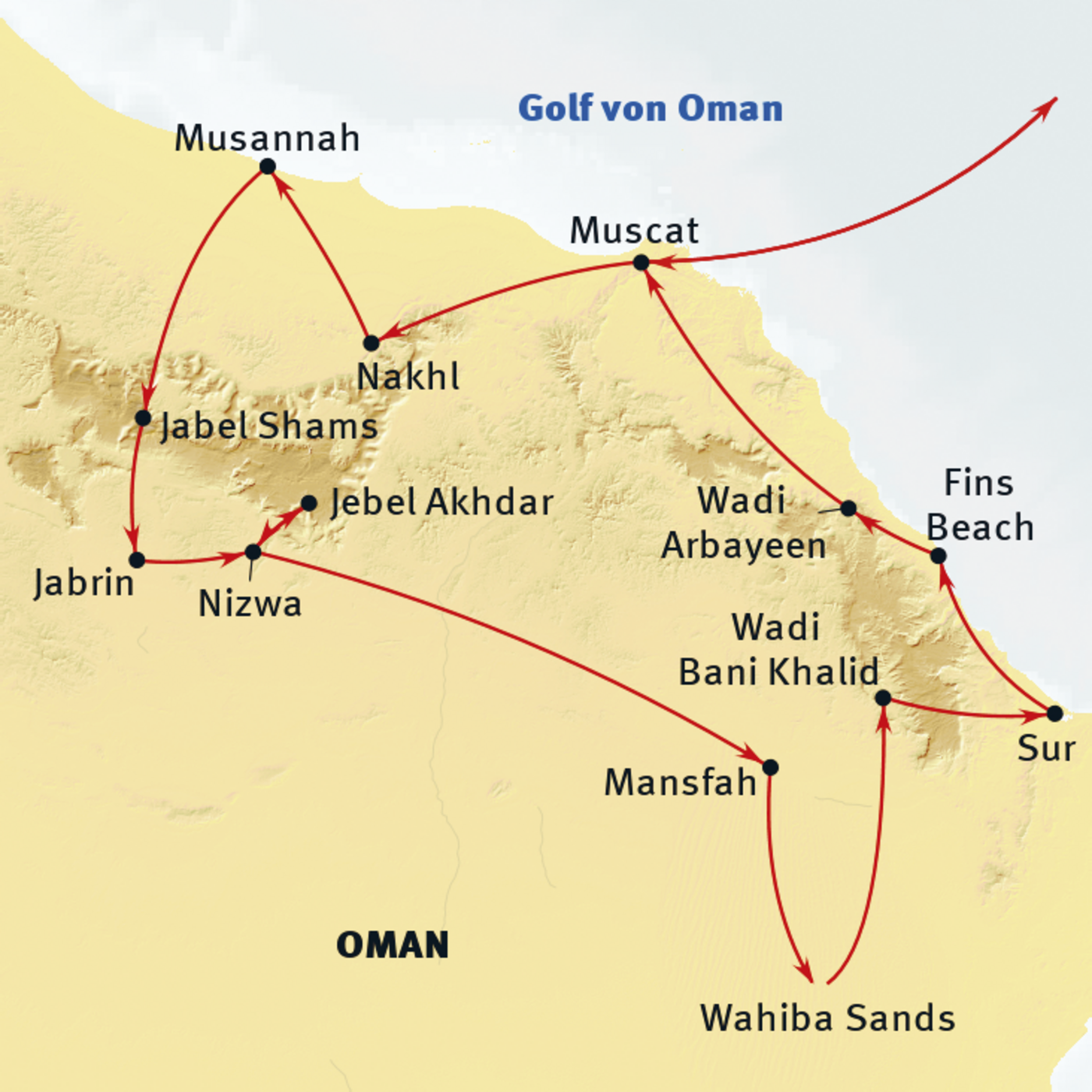 Muscat - Nakhl - Rustaq - Mussanah - Murri - Ibri - Bat - Jabal Shams - Jabrin - Misfat - Nizwa - Birkat Al Mauz - Jabal Akhdar - Mansfah - Wahiba Sands - Wadi Bani Khalid - Sur - Wadi Arbayeen - Fin's Beach - Muscat