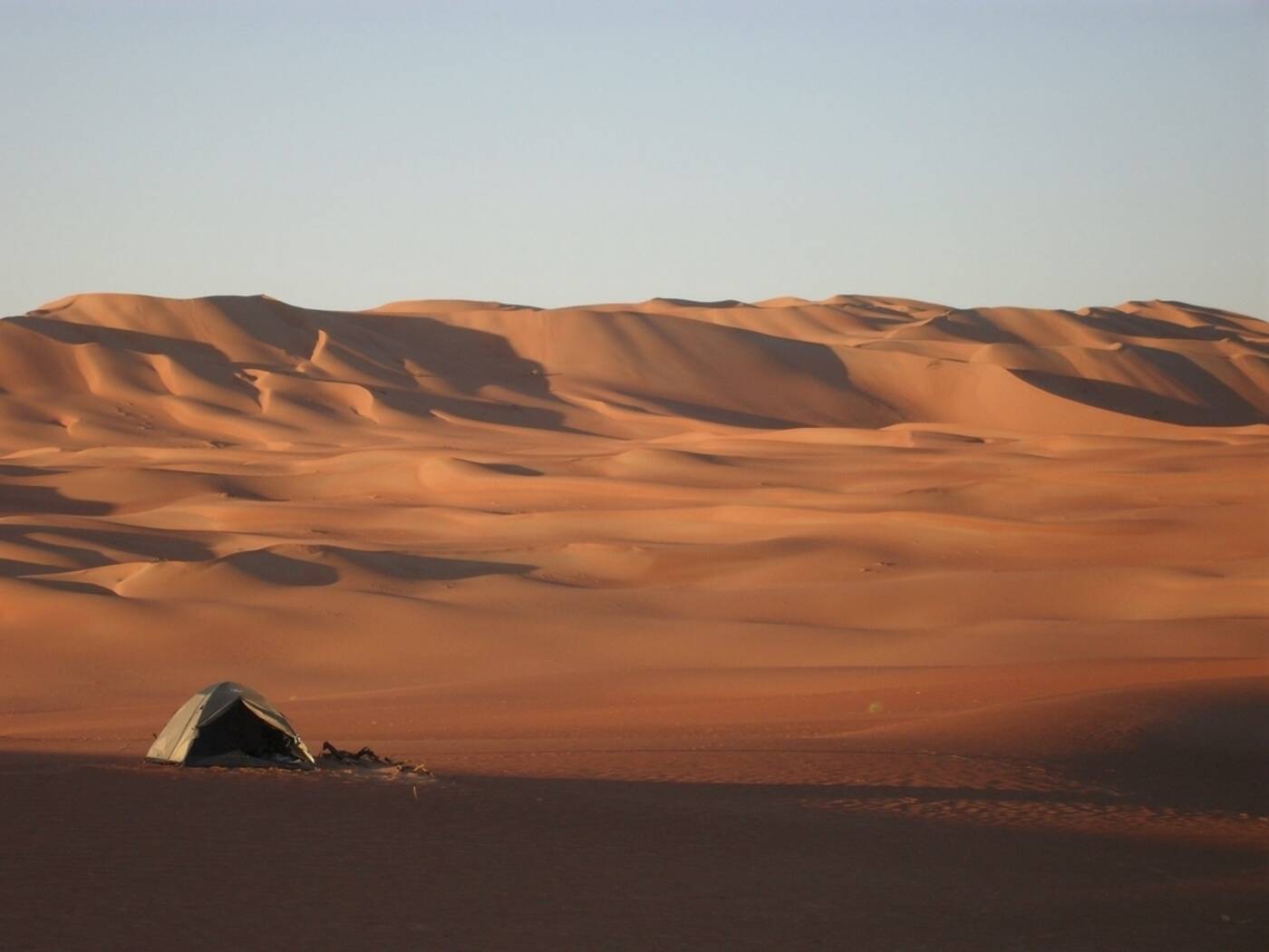 Wir tauchen tiefer ein in dieses schier endlose Dünenmeer, die Fahrt nun auf Piste, ein echtes Abenteuer! Im Laufe des späten Nachmittags suchen wir uns einen einladenden Platz zwischen den Dünen für unsere erste Zeltnacht bei Muqshin. Das Abendessen nun am Lagerfeuer zubereitet. (200 km)