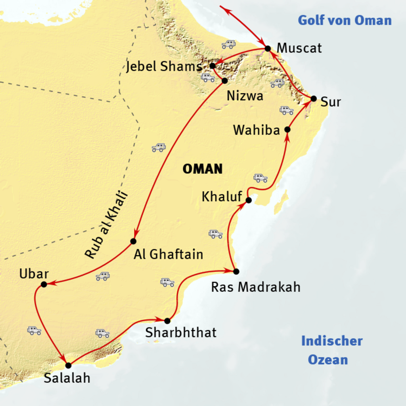 Muscat - Nahkl - Wadi Bani Awf - Jabal Shams - Jabrin - Al Hamra - Misfat - Nizwa - Al Ghaftain - Muqshin - Rub al-Khali - Salalah - Wadi Shuwaymiyah - Sharbhthat - Wadi Shuwaymiyah - Sharbhthat - Qihad - Wahiba Sands - Wadi Bani Khalid - Sur - Muscat