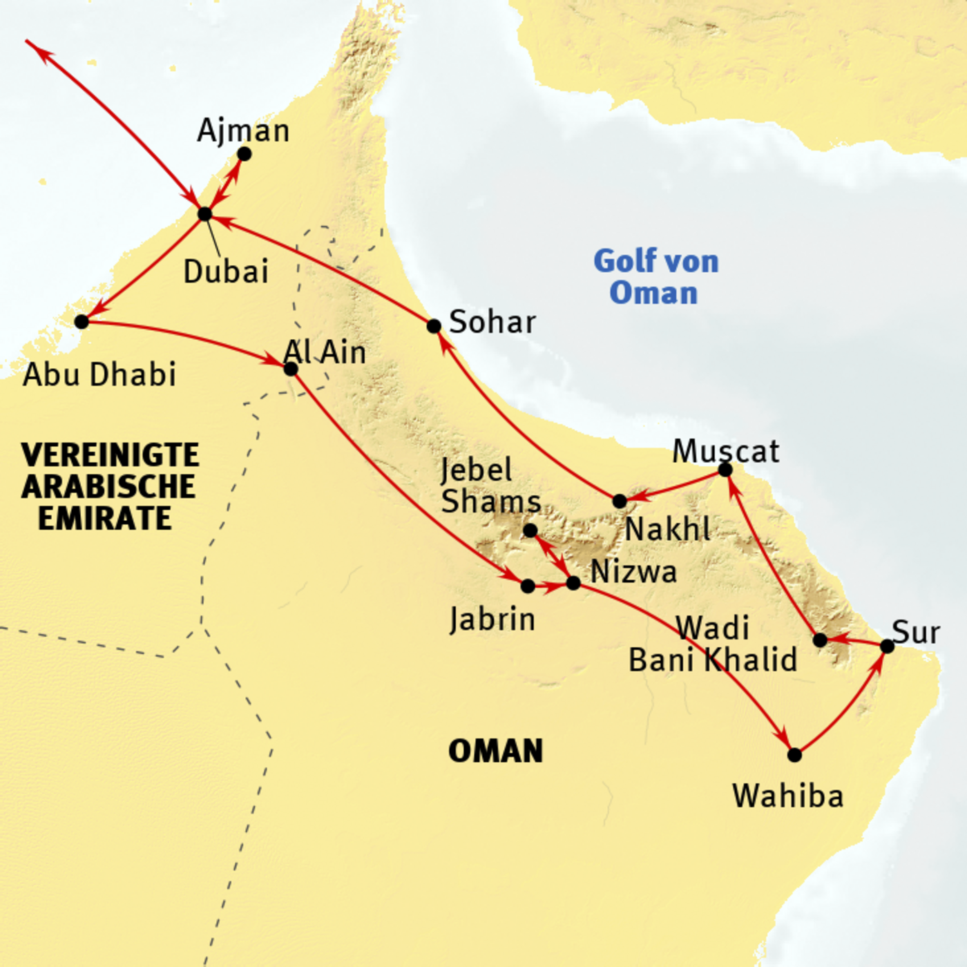 Dubai - Abu Dhabi - Al Ain - Jabrin - Nizwa - Jabal Shams - Al Hamra - Wahiba Sands - Sur - Wadi Bani KhalidWadi Tiwi - Quriat - Muscat - Nakhl - Sohar - Dubai