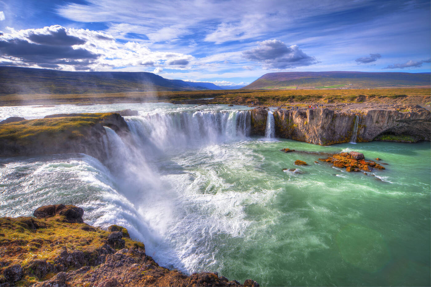 Über die einsame und mondähnliche Hochebene bei Mödrudalur gelangen wir ins Gebiet des Sees Myvatn. Hier treffen "Himmel und Hölle" aufeinander. Am Fuße des Berges Namafjall liegt das stark schweflige Solfatarengebiet Namaskard mit brodelnden Schlammtöp-fen und Heißdampfquellen. Der See Myvatn (dt. Mückensee) ist besonders wegen seiner außerordentlich hohen Anzahl verschiedenster Entenarten bei Vogelliebhabern bestens bekannt. Hier befindet sich ebenfalls der große Ringwallkrater Hverfell (auch Hverfjall genannt). Die eindrucksvollen schwarzen Lavaformationen Dimmuborgir „Dunkle Burgen“ sind Überreste eines Lavasees, dessen bereits erstarrten Teile als bizarre Formationen zurückblieben, nachdem der Damm brach und die Lava in Richtung des Sees Myvatn abfloss. Pseudokrater sind ein weiteres geologisches Phänomen, das uns in dieser Gegend begegnen wird. Auf dem Weg in Richtung Akureyri besichtigen wir den Godafoss, den "Wasserfall der Götter" (Tagesdistanz ca. 270 km).