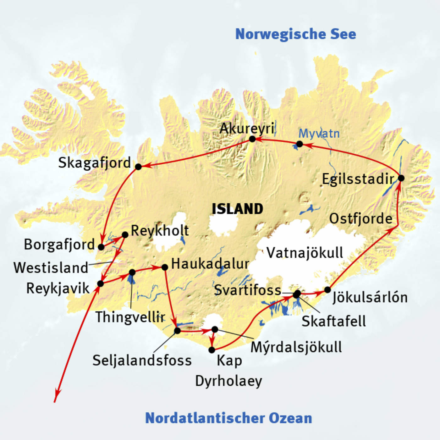 Reykjavik - Thingvellir Nationalpark - Geysire - Wasserfall Gullfoss - Kap Dyrholaey - Skaftafell - Vatnajökull - Ostfjorde - Egilsstadir - Myvatn - Akureyri - Skagafjord - Borgarfjord - Westisland - Reykjavik