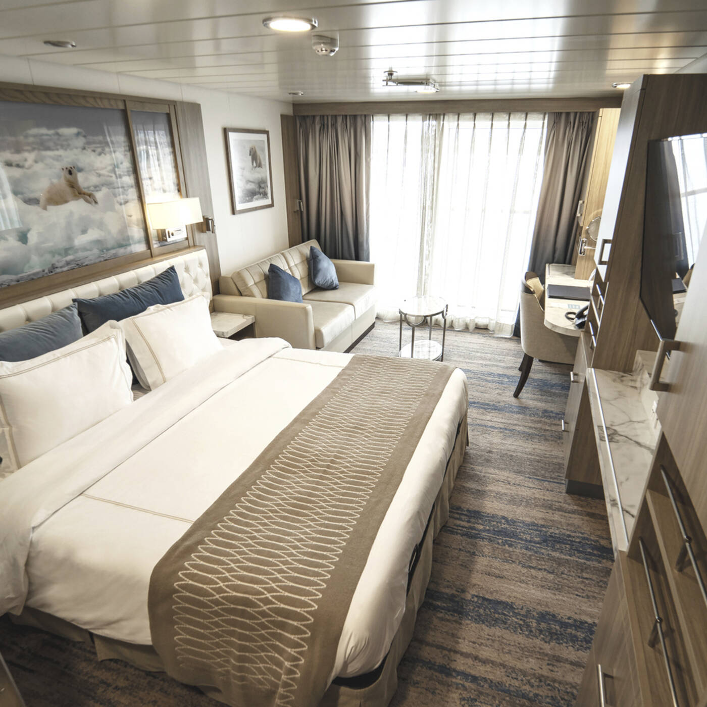 - Kat. H = Captain's Suite, Deck 4, Doppelbett oder zwei Einzelbetten, Du/WC,TV, privater Balkon, 44 m²