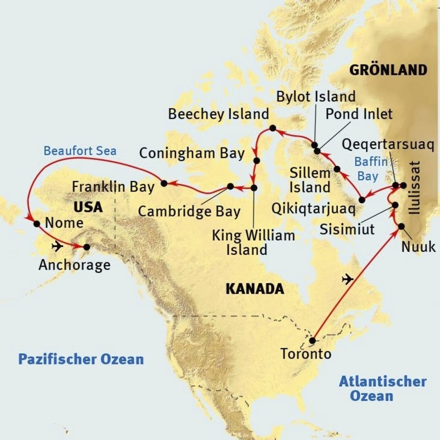 Toronto - Nuuk - Sismiut - Ilulissat - Qeqertarsuaq (Disko Island) - Baffin Island - Devon Island - Amundsen Golf - Beaufort See - Tschuktschensee - Bering Strasse - Nome - Anchorage