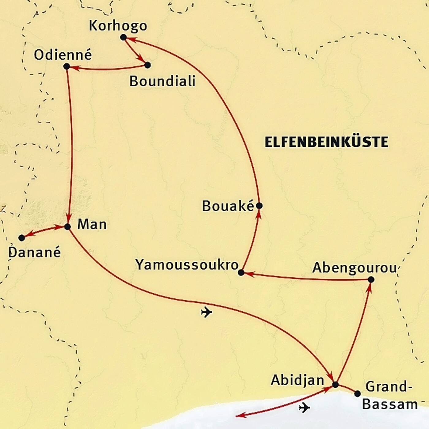 Abidjan - Abengourou - Yamoussoukro - Bouake - Korhogo - Boundiali - Odienne - Man - Danané - Abidjan - Grand Bassam - Abidjan