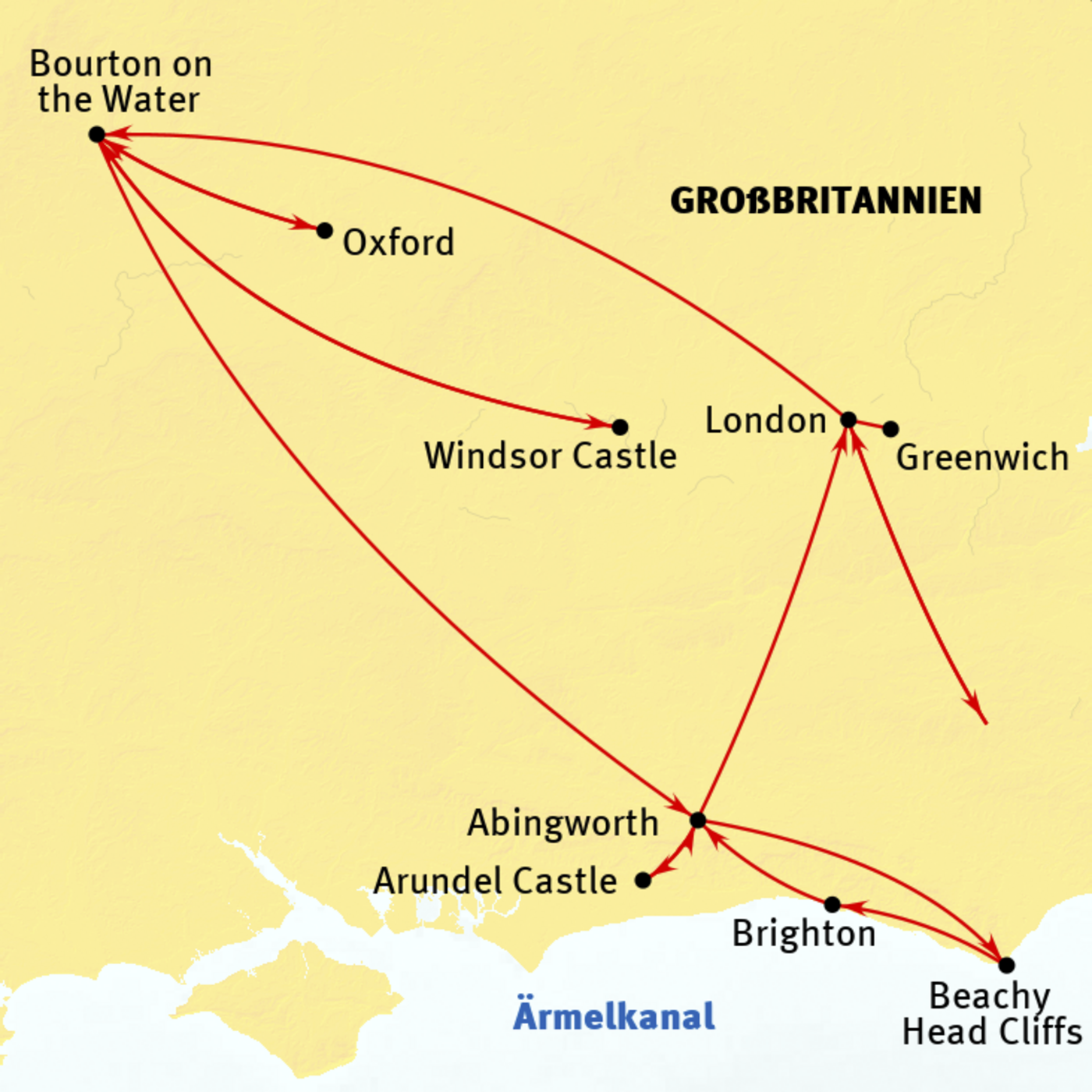 Südengland zählt zu den schönsten und vielfältigsten Regionen Großbritanniens. Die Landschaften reichen von sanften Hügeln und idyllischen Dörfern bis hin zu beeindruckenden Küstenabschnitten und malerischen Buchten. Die harmonische Verbindung von Natur, historischen Orten und lebendigen Städten verleiht der Region eine einzigartige Atmosphäre, die zugleich nostalgisch und lebendig wirkt. Die Gegend ist reich an historischen Sehenswürdigkeiten: ehrwürdige Herrenhäuser, prachtvolle Schlösser, mittelalterliche Burgen sowie charmante viktorianische Seebäder und kulturhistorische Stätten prägen das Bild Südenglands. Auch die nahegelegene Metropole London mit ihrer Mischung aus Geschichte und Moderne ist ein bedeutender kultureller Bezugspunkt der Region, besonders der historische Stadtteil Greenwich, bekannt u.a. für das Old Royal Naval College und den Nullmeridian. An der Südküste beeindruckt Beachy Head mit seinen imposanten weißen Kreideklippen, die zu den höchsten Großbritanniens zählen. Die traditionsreiche Universitätsstadt Oxford wiederum fasziniert mit ihrer einzigartigen Architektur und den historischen Colleges, die seit Jahrhunderten Studierende und Besucher aus aller Welt anziehen. Windsor Castle zählt zu einer der wichtigsten Attraktionen, die einen eindrucksvollen Einblick in die Geschichte der britischen Monarchie bietet. Südengland besticht außerdem durch seine vielfältigen Gartenanlagen, die dank des milden, vom Golfstrom beeinflussten Klimas ganzjährig in Blüte stehen. Die malerischen Cotswolds stehen exemplarisch für das ländliche England – mit grünen Hügellandschaften, gemütlichen Cottages, traditionellen Steinmauern und urigen Dörfern. Der königliche Süden Englands begeistert mit landschaftlicher Schönheit ebenso wie mit kulturellem Reichtum.