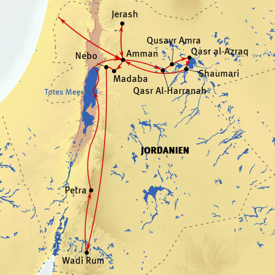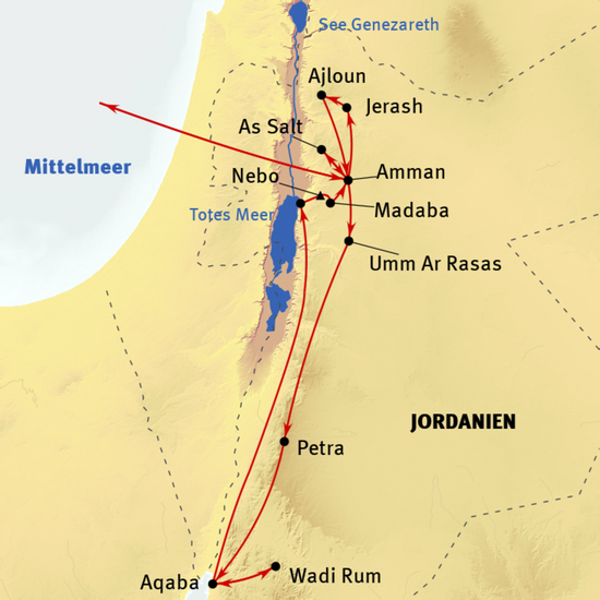 - mit der Wüste Wadi Rum, der Nabatäerstadt Petra