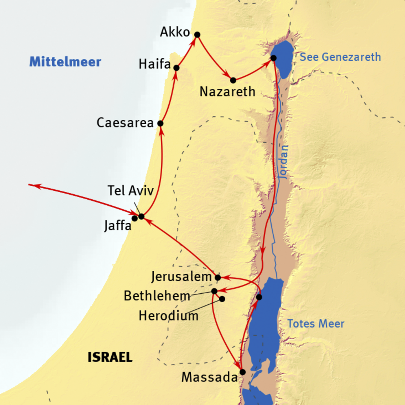 Tel Aviv - Jaffa - Caesarea - Wadi Ara - Haifa - Akko - Nazareth - See Genezraeth - Golan-Höhen - Totes Meer - Bethlehem - Jerusalem