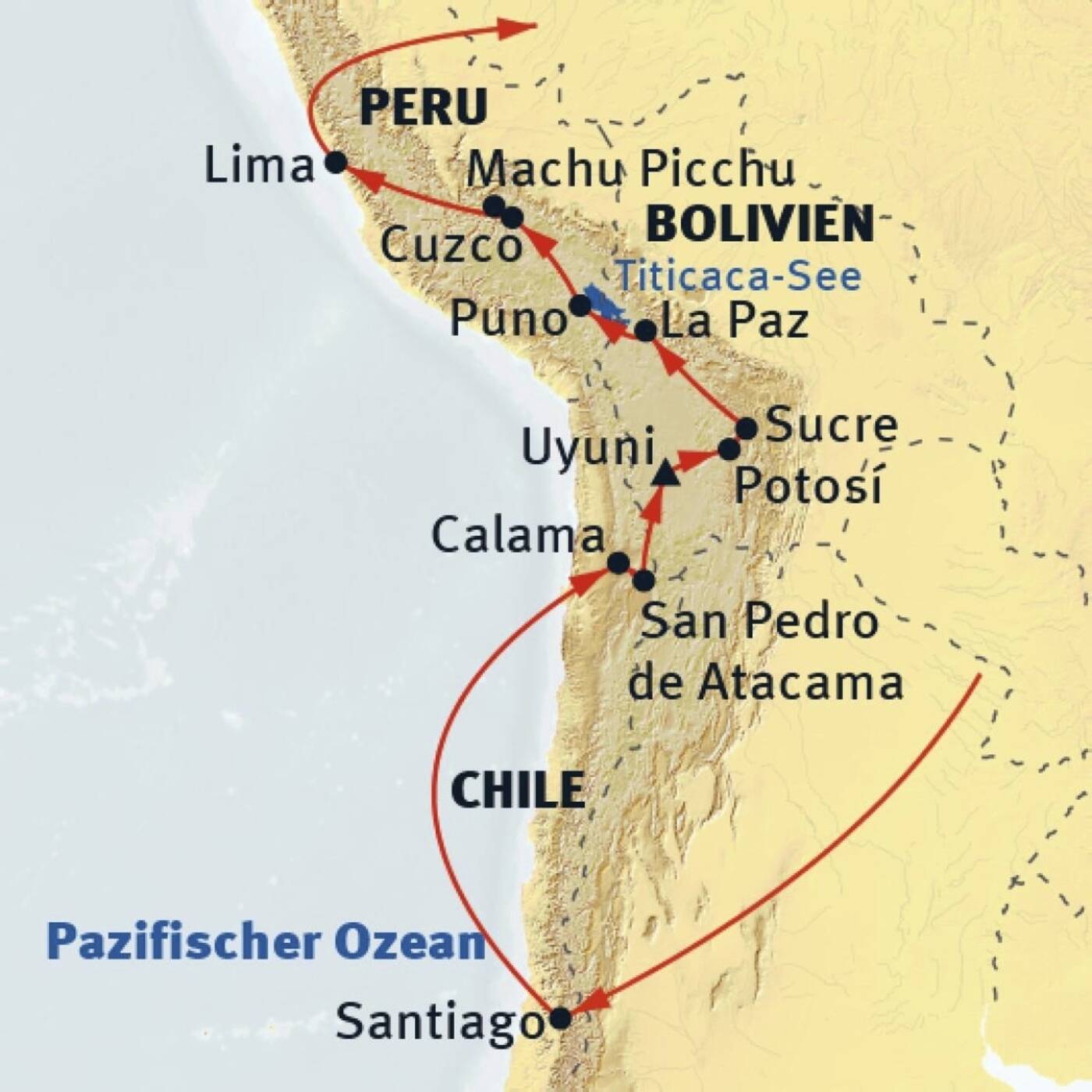 Santiago de Chile – San Pedro de Atacama – San Juan – Salar de Uyuni – Potosí – Sucre – La Paz – Titicaca-See – Cusco – Machu Picchu