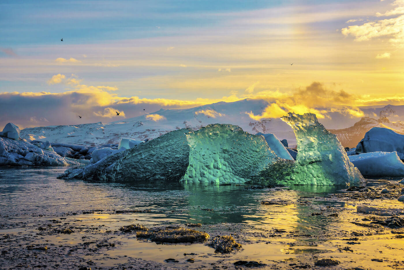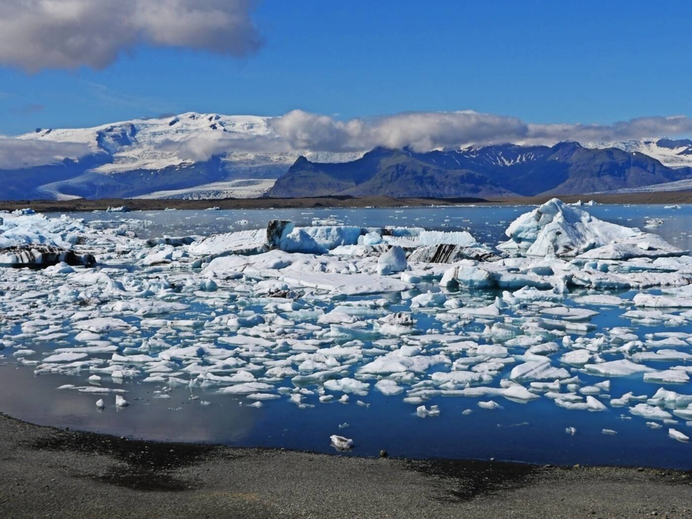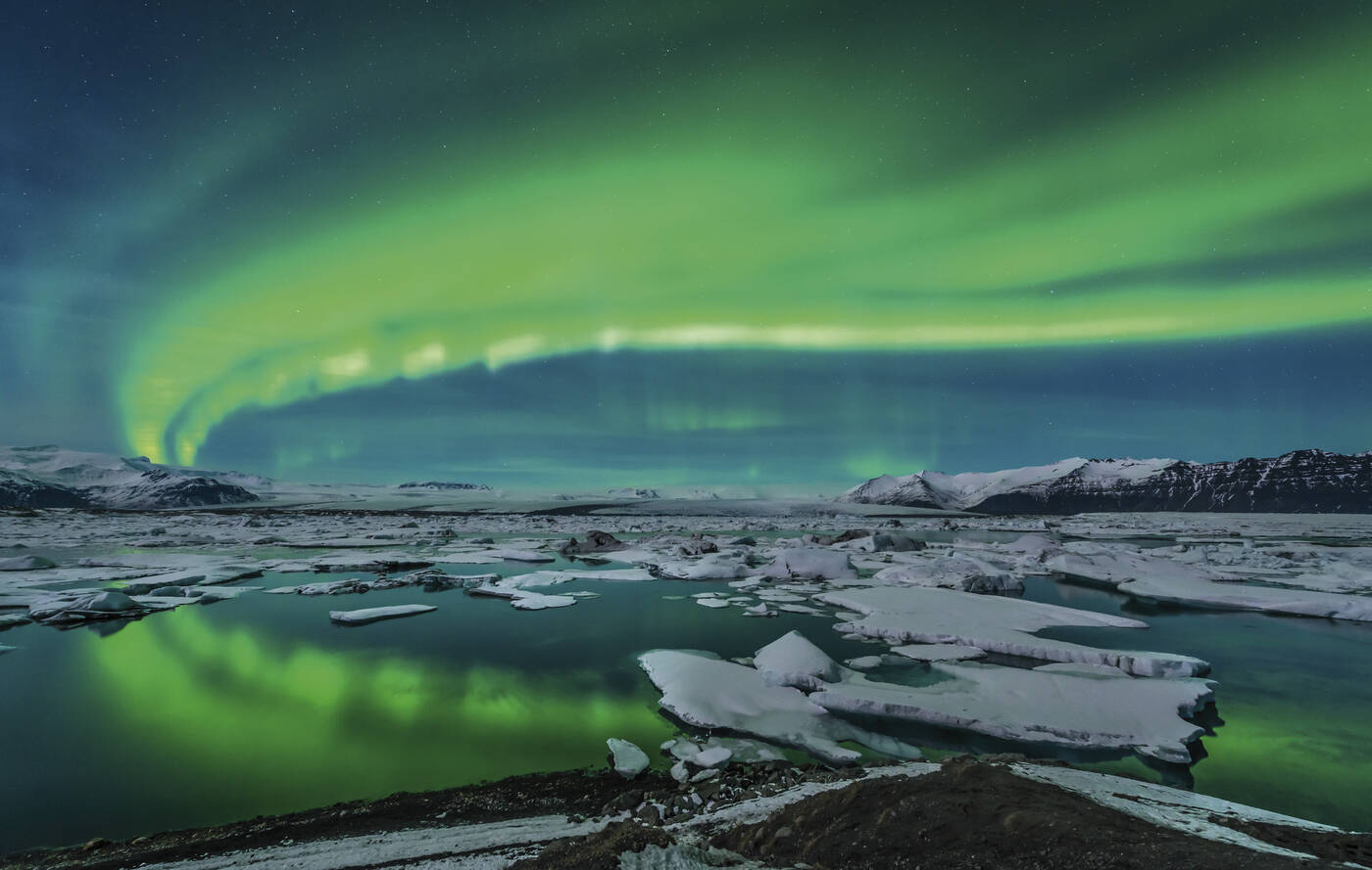 Über die Sanderebenen Myrdalssandur und Skeidararsandur fahren wir in Richtung Südosten. An den südlichen Ausläufern des Gletschers Vatnajökull, dem mit über 8.000 km² größten Gletscher Europas, halten wir in Skaftafell, einer Oase zwischen den Gletschern. Es bietet sich Gelegenheit zu einer kleinen Wanderung in Begleitung des Reiseleiters oder einem einfachen Spaziergang. Im Anschluss geht es zum eindrucksvollen Vatnajökull. Zu den Höhepunkten des Tages gehört die Gletscherlagune Jökulsarlon. Auf dem Wasser treiben Eisberge in allen Größen, zum Teil durchzogen von schwarzen Streifen, die von Vulkanasche herrühren, in Richtung Meer – ein faszinierendes Schauspiel. Abendessen und Übernachtung am Fuße des Gletschers Vatnajökull.