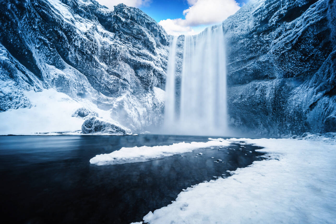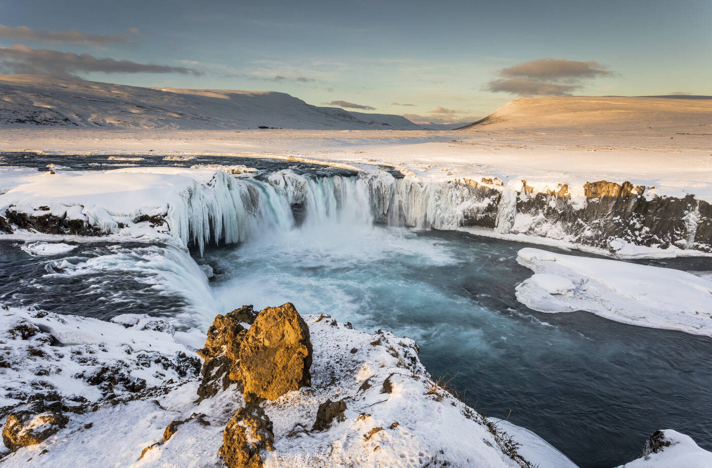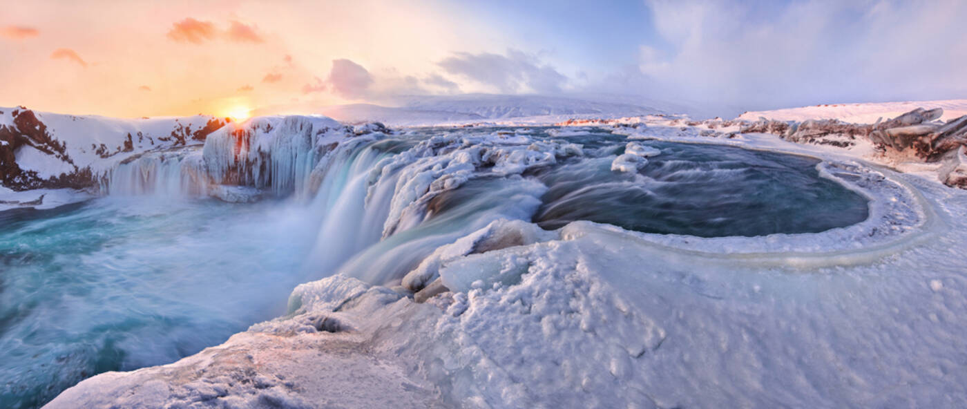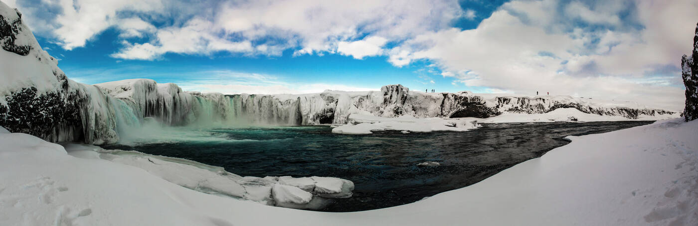 Der gesamte Tag ist Nordisland und dem beeindruckenden Gebiet rund um den See Myvatn gewidmet. Auf dem Weg besichtigen wir zuerst den Godafoss, den "Wasserfall der Götter". Im Winterkleid zeigt Nordisland seinen besonderen Reiz, die gefrorenen Wasserfälle unweit der vielen heißen Quellen stehen für die großen Gegensätze der Insel aus Feuer und Eis. Der See Myvatn (dt. Mückensee) ist besonders wegen seiner außerordentlich hohen Anzahl verschie-denster Entenarten bei Vogelliebhabern bestens bekannt. Hier befindet sich der große Ring-wallkrater Hverfell (auch Hverfjall genannt). Die eindrucksvollen schwarzen Lavaformationen Dimmuborgir „Dunkle Burgen“ sind Überreste eines Lavasees, dessen bereits erstarrten Teile als bizarre Formationen zurückblieben, nachdem der Damm brach und die Lava in Richtung des Sees Myvatn abfloss. Pseudokrater sind ein weiteres geologisches Phänomen, das uns in die-ser Gegend begegnen wird. Ein entspannendes Bad im Myvatn Nature Bath, der Blauen Lagune des Nordens, rundet diesen Tag ab (Eintritt inkl., Handtücher können geliehen werden). Abendessen und Übernachtung wie am Vortag.