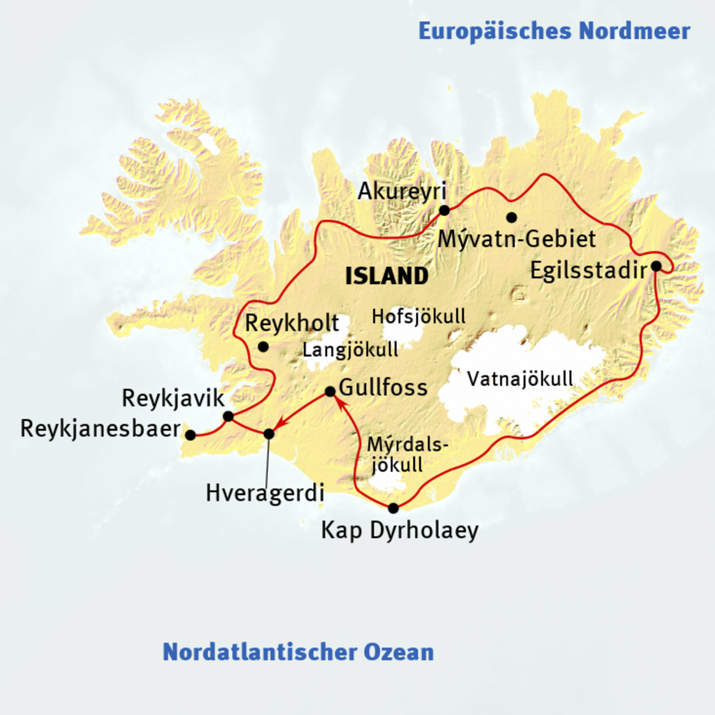 Reykjavik - Thingvellir - Geysire - Gulfoss - Kap Dyrholaey - Kirkjubaejarklaustur - Skaftafell - Vatnajökull - Jökulsarlon - Ostfjorde - Egilsstadir - See Myvatn - Akureyri - Skagafjord - Borgarfjord - Westisland - Reykjavik