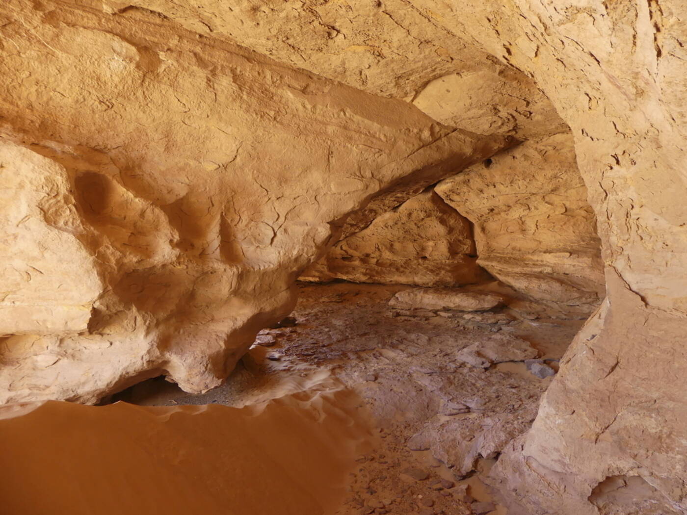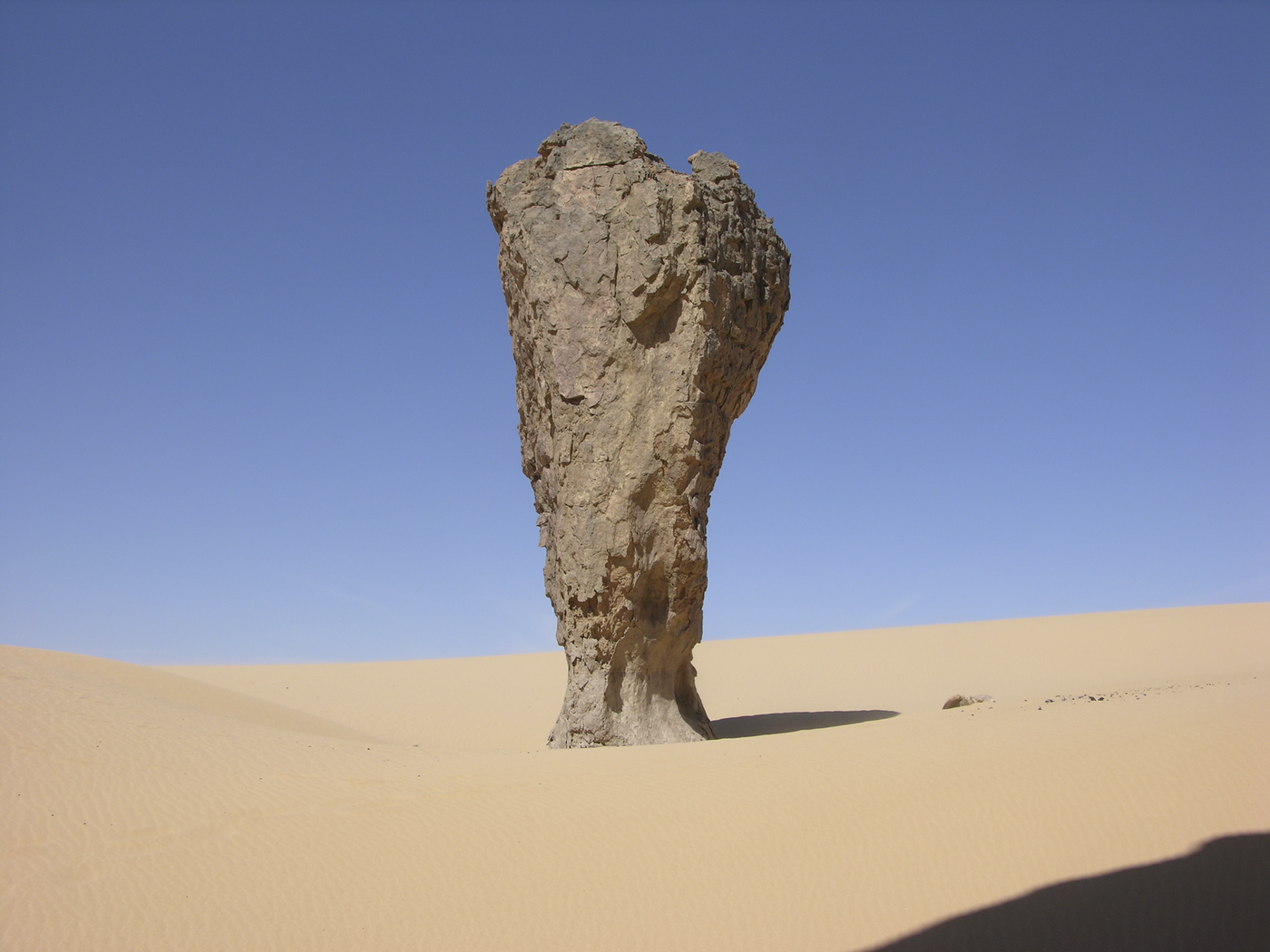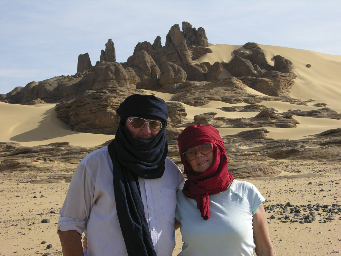 Wir erkunden heute die Gegend von Tikobaouine am Fuße des Tassilis. Plötzlich ragt vor uns ein riesiger Felsbogen aus Sandstein auf, der von jeder Seite anders wirkt. Danach sehen wir ein prähistorisches, sogenanntes Schlüssellochgrab mit mehreren Metern Durchmesser, am Hang liegend. Es ist das Grab einer wichtigen Persönlichkeit. Dann steuern wir den großen Ozean aus Sand an, die Dünen des Erg Iharan. Dort werden wir heute übernachten, unsere Begleiter führen alles mit. Sie zeigen uns, wie Nomaden in der Wüste Brot backen, als Fladen im Sand und bereiten für uns das traditionelle Nationalgericht der Touareg zu, die Tagella. Langsam erscheint über unseren Köpfen das Zelt aus Sternen, die Chance, Sternschnuppen zu sehen ist groß. Übernachtung im Zelt oder wer mag unter freiem Sternenhimmel.
