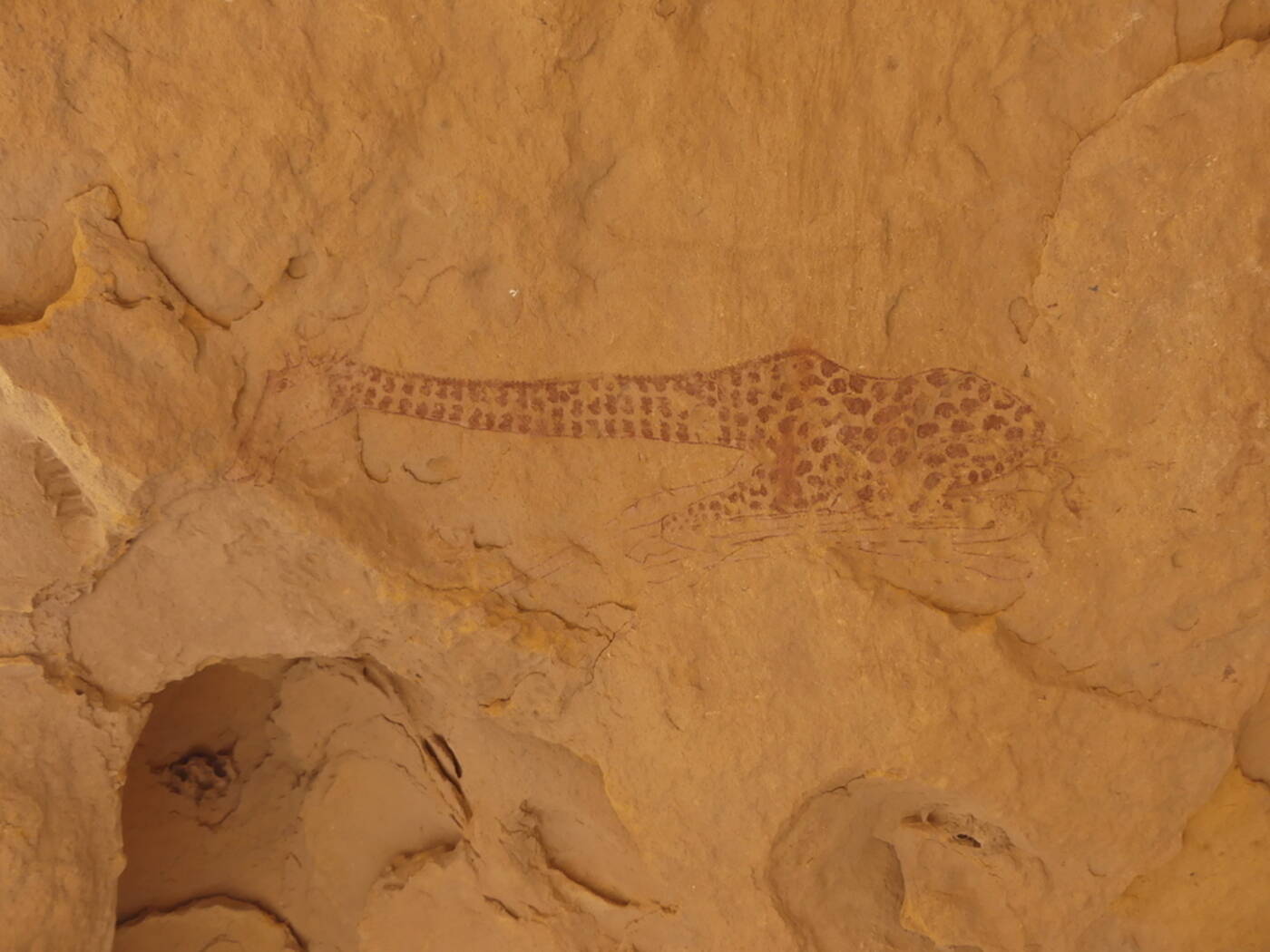 Im Tassili n´Ajjer finden sich viele so genannte "Abri" (offene Höhle/Felsvorsprung) mit bis zu 10.000 Jahre alten Malereien aus prähistorischer Zeit. Hier in Tikadiouine wurde mit sehr feinen Linien gezeichnet, bei den Hasendarstellungen sind sogar Haare erkennbar. Bemerkenswert ist auch eine Schlacht-Szene, bei der man das Zerlegen eines Tieres erkennen kann. Vom Plateau geht es hinunter nach Essendilène. Dort spazieren wir durch die Schlucht zum Guelta (Wasserbecken), das inmitten ausgeschliffener Canyon-Felswände liegt, die sich im Wasser spiegeln. Mit etwas Glück blüht üppig der Oleander. Nach dem Mittagspicknick fahren wir wieder ins Tiefland am Fuß des Tassili-Massifs (was in dieser Gegend immer noch knapp 1.000 m über dem Meeresspiegel bedeutet). Im Laufe des Nachmittags sind wir zurück in Djanet und besuchen den lokalen Markt mit Gebrauchswaren und Touareg-Handwerk (v.a. Lederarbeiten und schöner Silberschmuck). Übernachtung im Hotel.