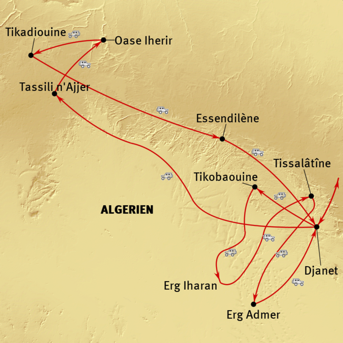 Algier - Djanet - Tassili n'Ajjer - Oase Iherir - Aghram - Tikedaouien - Essendilene - Tassili- Massiv - Djanet - Tikobaouine - Erg Iharan - Tissalaten - Erg Admer - Djanet - Algier