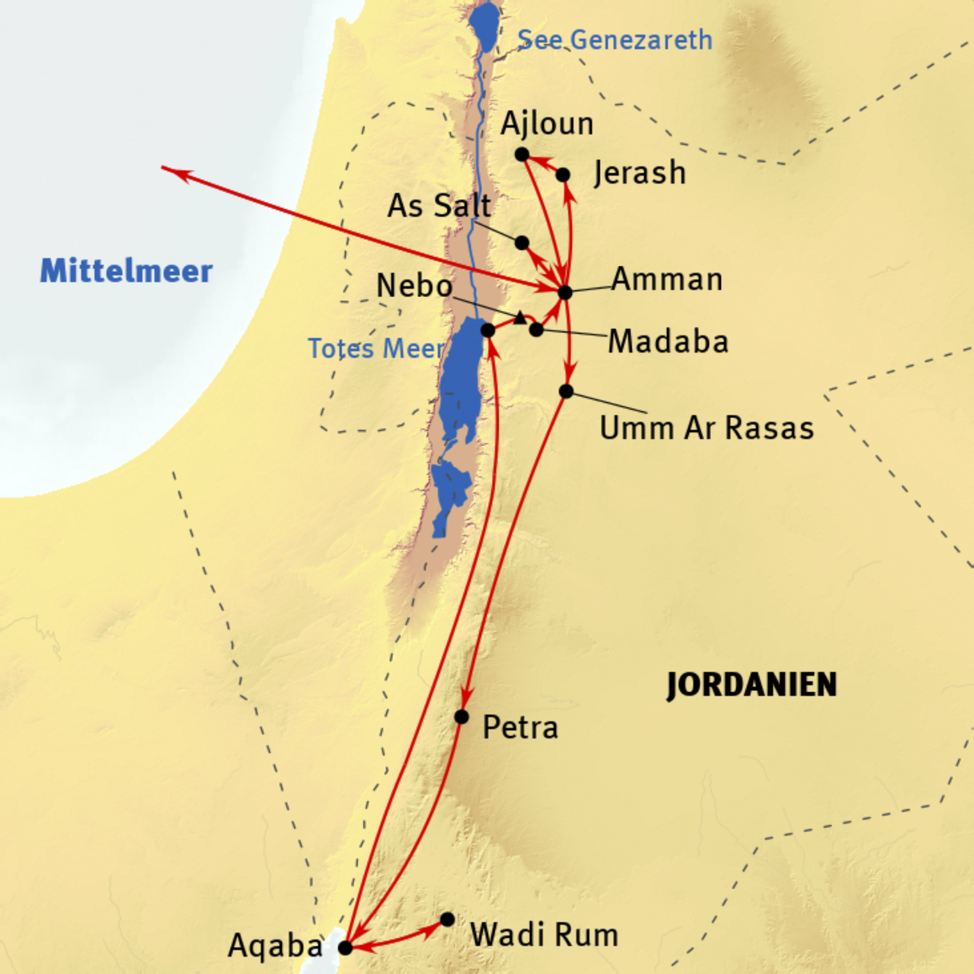 Die Kulturmonumente des Haschemitischen Königreichs Jordanien gehören zu den wichtigsten Besichtigungsattraktionen des Nahen Ostens. Römer, Byzantiner, Araber, Kreuzritter und Osmanen sowie die Weltreligionen Judentum, Christentum und Islam hinterließen hier ihre Spuren. Während dieser Reise werden eindrucksvolle greco-romanische Ruinen, Ritterburgen aus der Zeit der Kreuzzüge und die Wüstenlandschaft des Wadi Rum erkundet sowie im Toten Meer gebadet. Der Höhepunkt der Reise ist sicherlich Petra, die von den Nabatäern erbaute imposante Königsstadt. Streckenweise verläuft die Tour auf der historisch bedeutenden Königsstraße, ehemals eine der ältesten Handels- und Karawanenstraßen zwischen Babylon und Ägypten. In acht Tagen die Besichtigungshöhepunkte Jordaniens kennenzulernen, gelingt nur aufgrund der relativ kurzen Fahretappen in diesem von der Größe her überschaubaren Land (die Nord-Süd-Ausdehnung beträgt ca. 430 km). Dennoch ist Jordanien wie eine Schatzkammer mit historischen und archäologischen Kostbarkeiten gefüllt. Hinzu kommt die Gastfreundlichkeit der Jordanier und das überaus leckere Essen.