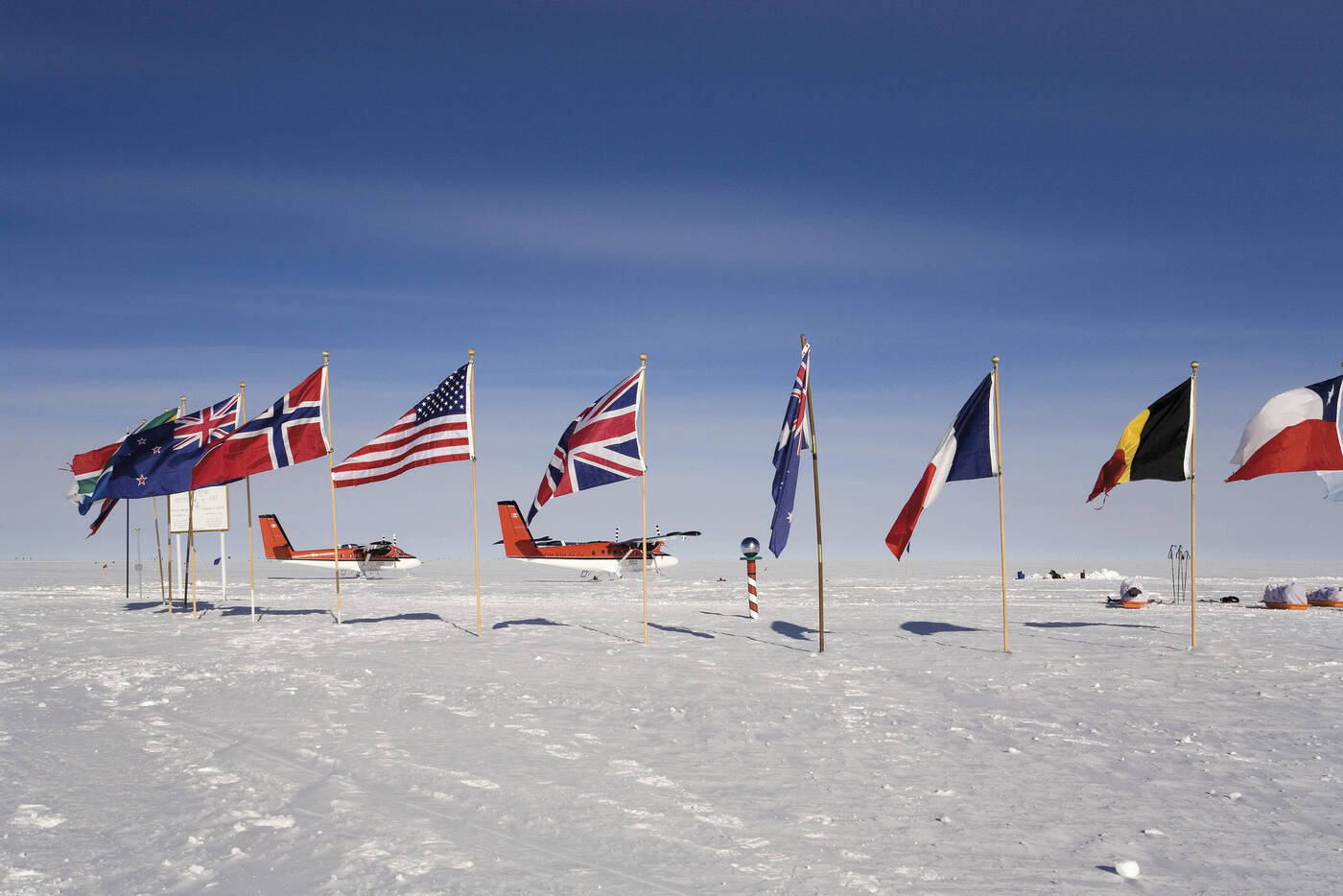 Sobald die Wetterbedingungen es zulassen, besteigen wir das Skiflugzeug und steuern den südlichsten Punkt der Erde an! Unser Flug ist so geplant, dass wir am selben Tag zurückkehren. Wir werden trotzdem Lebensmittel und Campingausrüstung mitnehmen - für den Fall, dass sich die Wetterbedingungen ändern und eine Übernachtung notwendig ist. Der Flug zum Pol dauert zwischen 4 und 6 Stunden. Wir fliegen über das Hochplateau, Gletscherspaltenfelder und eine endlose Weite von Weiß. Etwa auf halber Strecke zum Pol passieren wir das Thielgebirge. Wenn wir uns 90° Süd nähern, werden wir die Südpolstation schon sehen, umgeben nur von Schnee und Himmel. Unser Flugzeug landet auf einer Schneepiste und wir steigen in der Nähe der Südpolmarkierung aus. Unter unseren Füßen ist das Eis fast 10.000 Fuß (3000 m) dick! Endlich am Pol: Herzlichen Glückwunsch!