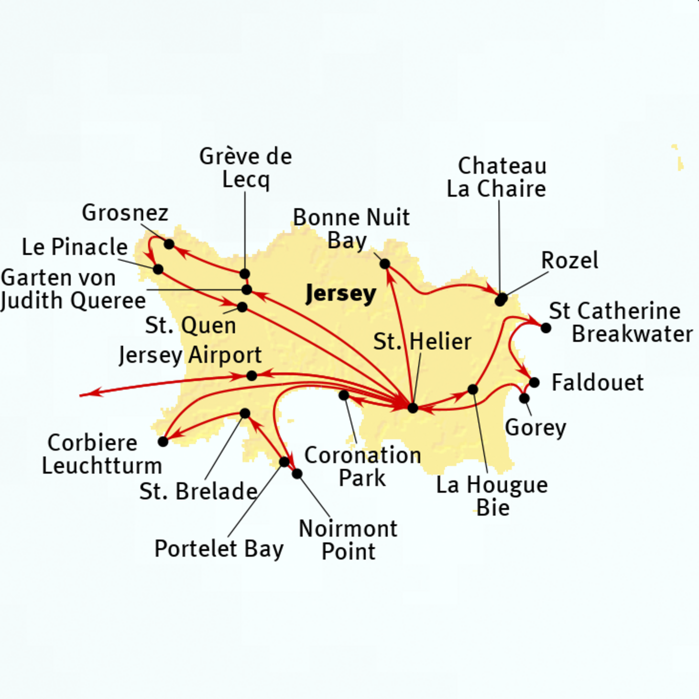 Der heutige Tag steht zur freien Verfügung. Besonders lohnenswert ist der Besuch des Jersey Zoo, der weltberühmt für seine artgerechte Haltung, seine Aufzuchtprogramme und sein weltweites Engagement für Schutzgebiete ist. Sehr empfehlenswert ist auch die Besichtigung von Samarès Manor, dem größten Herrenhaus und Garten der Insel. Diese lassen sich gut mit einem Besuch des Zoos oder einem Bummel durch das quirlige St. Helier verbinden, wo die viktorianischen Markthallen und die von Jugendstilkünstler Lalique entworfene Glas Church einen Besuch wert sind. Auch eine Fahrt oder Strandwanderung in den alten Hafenort St. Aubin, ein ehemaliges Piratennest, lohnt sich – hier finden Sie charmante Cafés, Pubs und Restaurants. Alle Orte sind gut an das Busliniennetz angebunden.