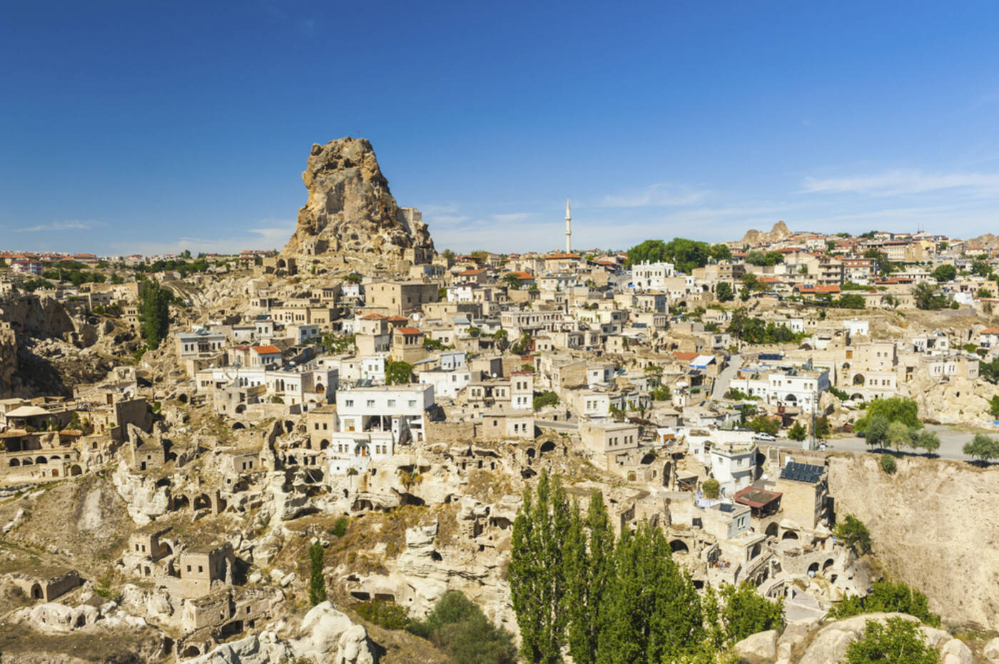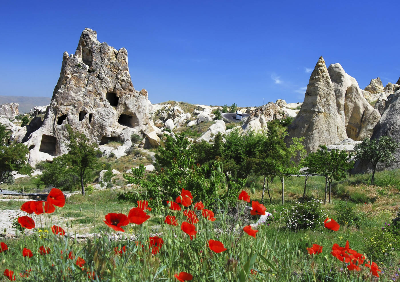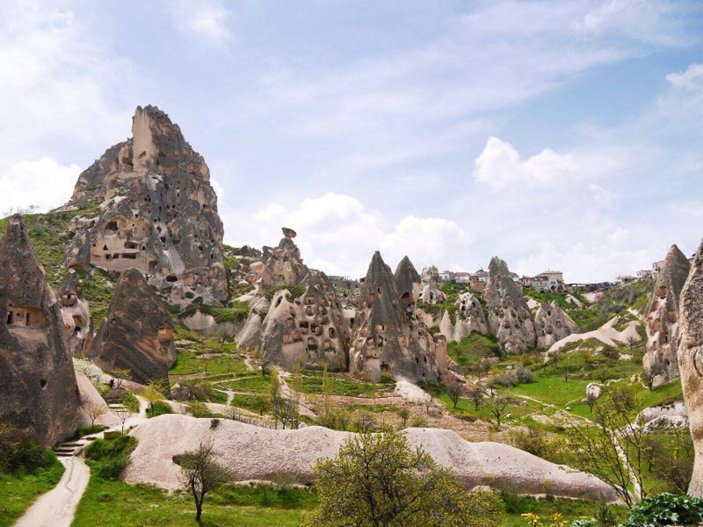 Frühmorgens Gelegenheit zur Teilnahme an einer einzigartigen Ballonfahrt über diese faszinierende Landschaft (vor Ort buchbar). Danach geht es nach Uchisar, von wo wir durch das Tauben-Tal laufen. Nachmittags eine leicht fordernde Wanderung hinab durch das Ask Vadisi-Tal (Liebestal). Dank der hohen Speicherfähigkeit des porösen Untergrundes plätschert ein kleiner Bach durch verlassene und daher verwilderte, wildromantische kleine Felder und Obstgärten. Die Felsformationen und sehr viel Grün machen den besonderen Reiz dieses abgelegenen Tales und dieser Wanderung aus. (170 Höhenmeter)