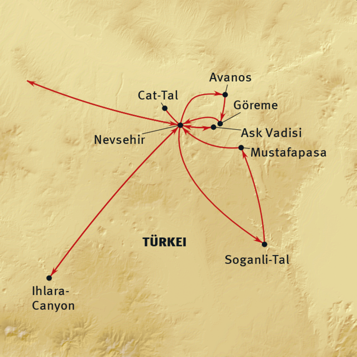 Nevsehir - Güzelyurt - Ihlara-Tal - Dirinkuyu - Ortahisar - Mustafapasa - Cat-Tal - Avanos - Göreme - Baglidere - Nevsehir