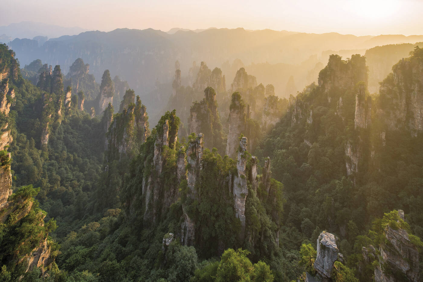 Heute ein ganztägiger Besuchstag in einem der schönsten und spektakulärsten Nationalparks Chinas. Wir fahren per Außenaufzug hinauf auf etwa 330m Höhe, von wo sich uns ein grandioser Blick auf den markanten Felsen-Wald (Yuanjiajie) bietet, mit einigen knapp 200m hohen in den Himmel ragenden Quarzsandtürmen, die bereits dem Kinofilm Avatar als Vorlage dienten. Ähnlich atemberaubend ist unser Gang über die 430m lange weltgrößte Glasbodenhängebrücke mit fantastischen Ausblicken. Die Ten-Mile-Gallery, einem Weg durch dieses Gelände, befahren wir mit einer kleinen Eisenbahn, den Tianzi Mountain hingegen fahren wir hinauf mit einer Seilbahn.